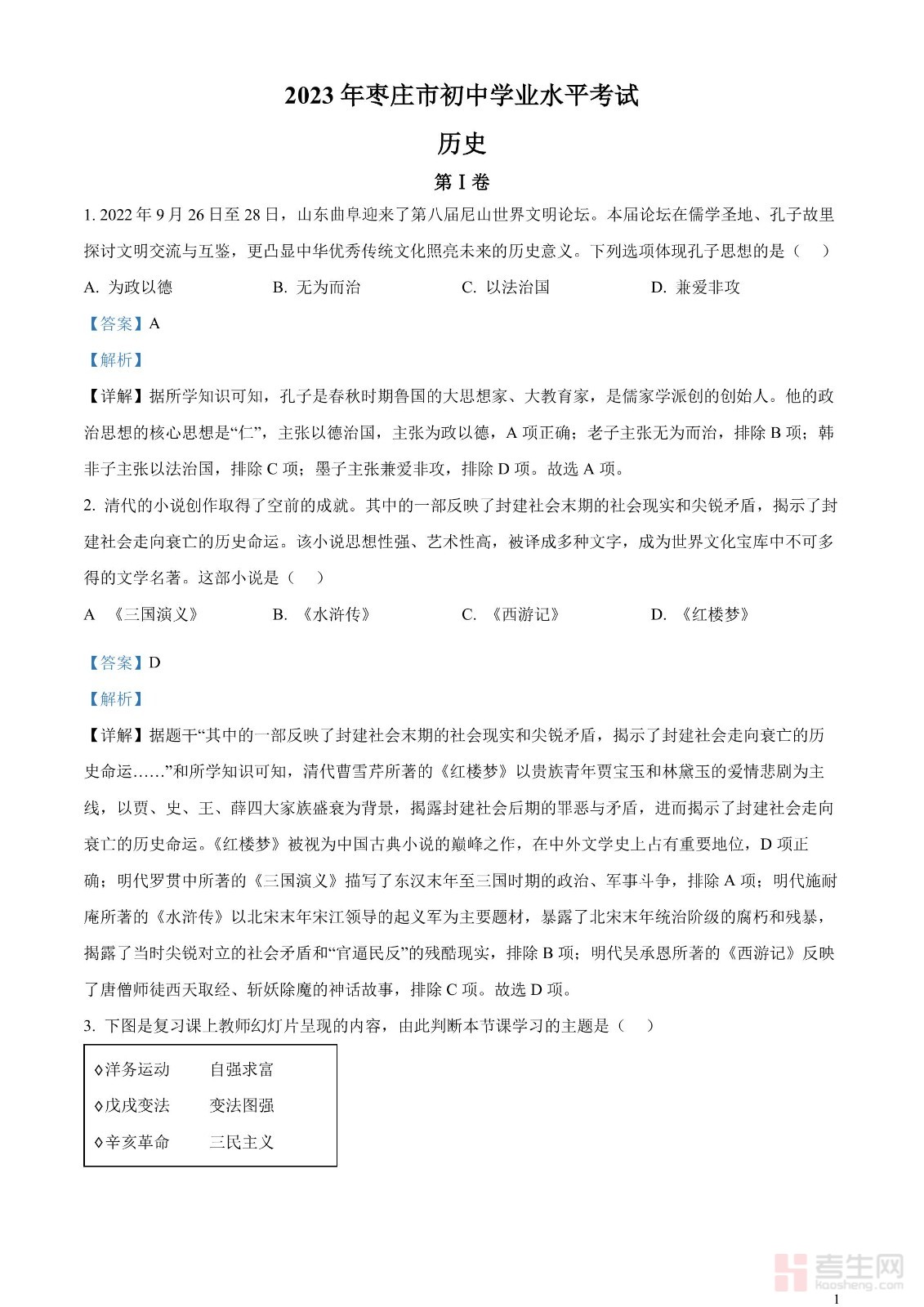 2023年山东省枣庄市中考历史真题(解析版)