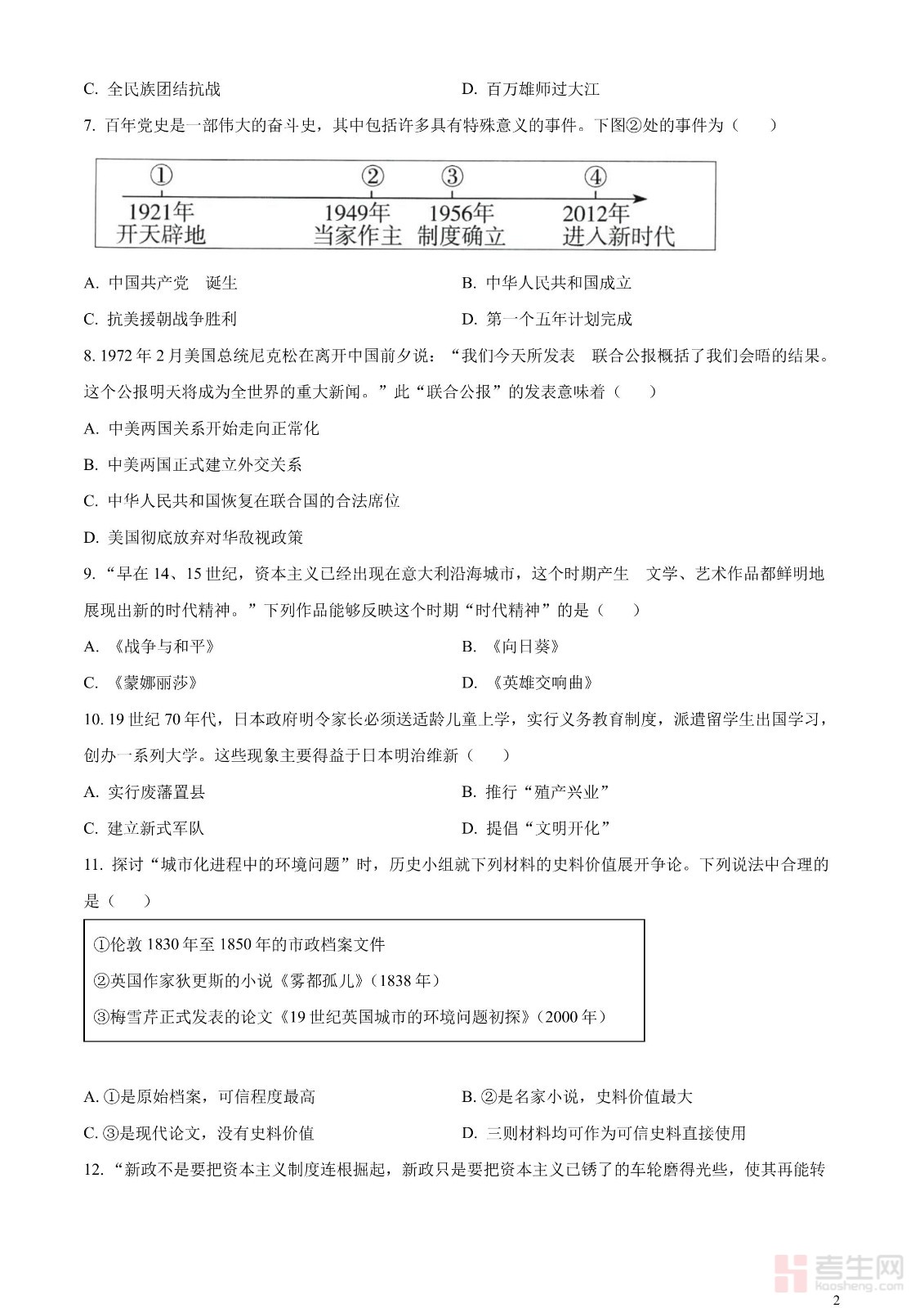 2023年山东省淄博市中考真题历史试题(原卷版)