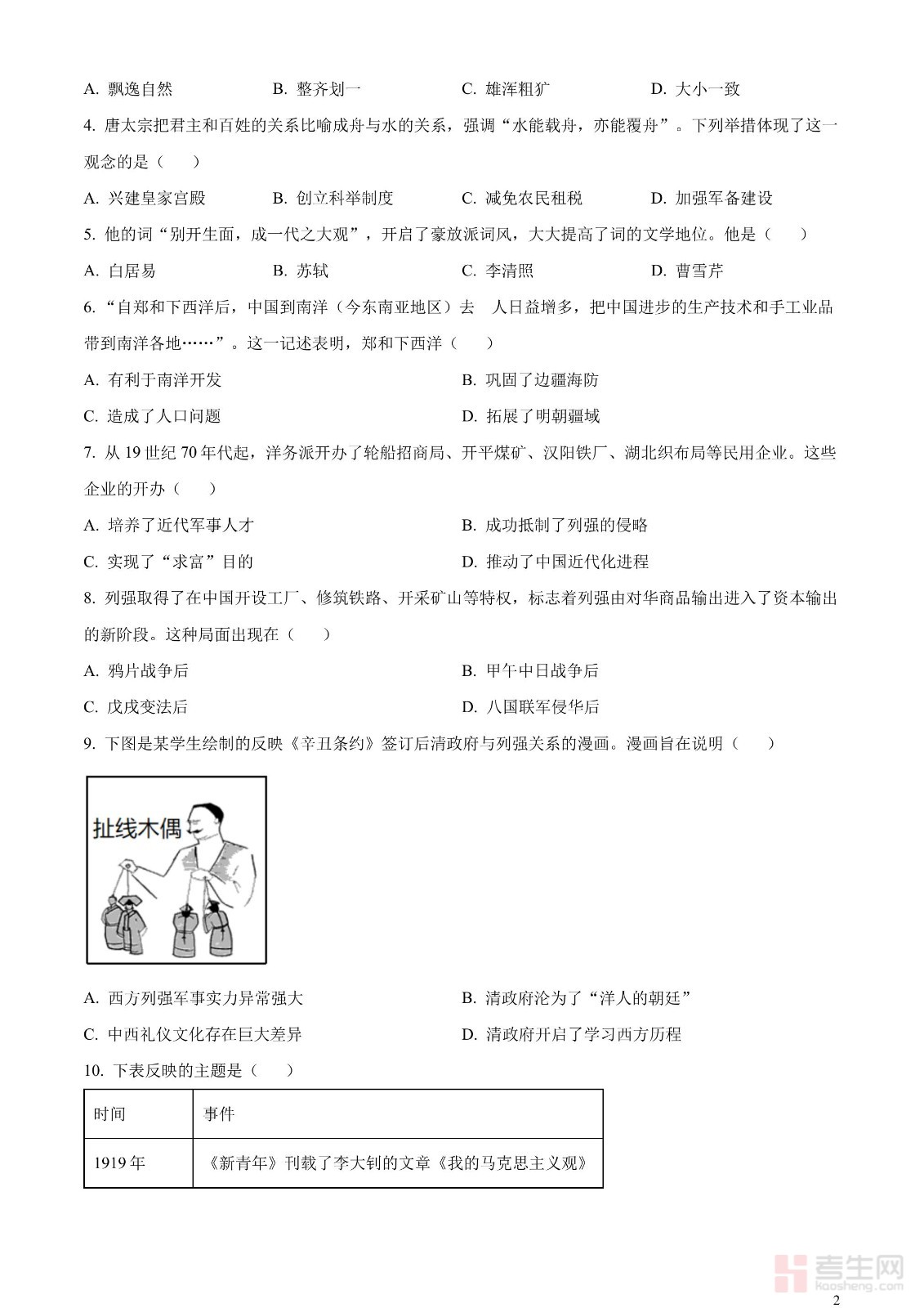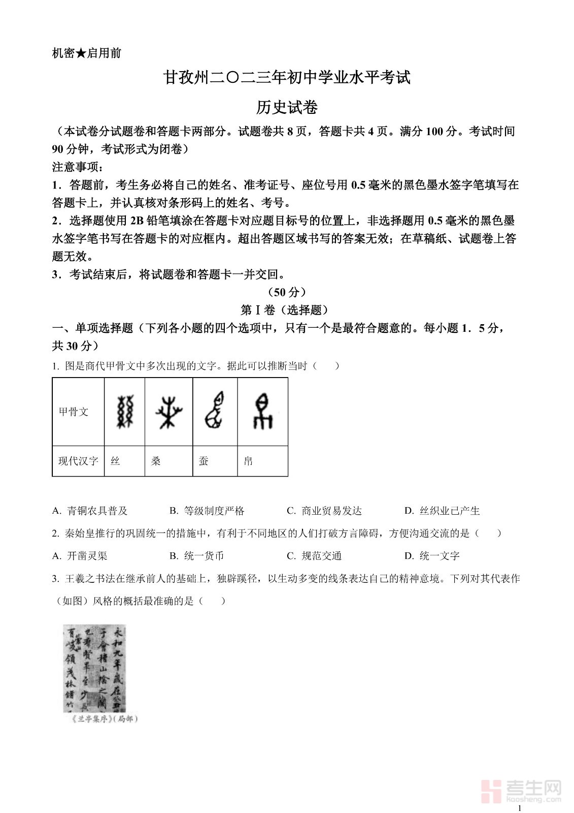 2023年四川甘孜藏族自治州中考历史真题(原卷版)