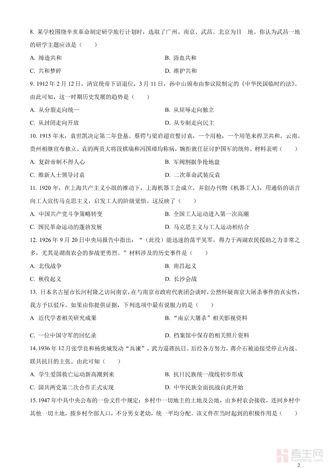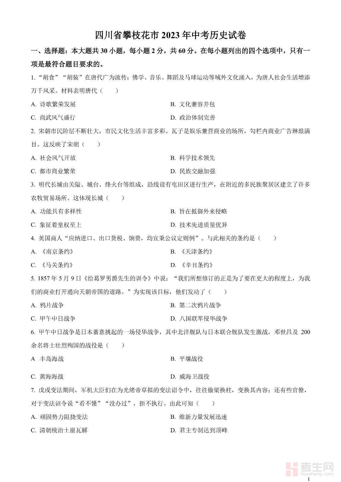 2023年四川省攀枝花市中考历史真题(原卷版)
