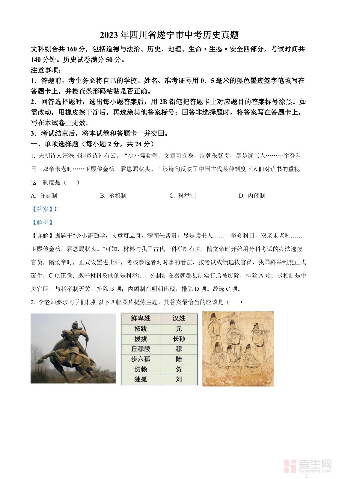 2023年四川省遂宁市中考历史真题(解析版)