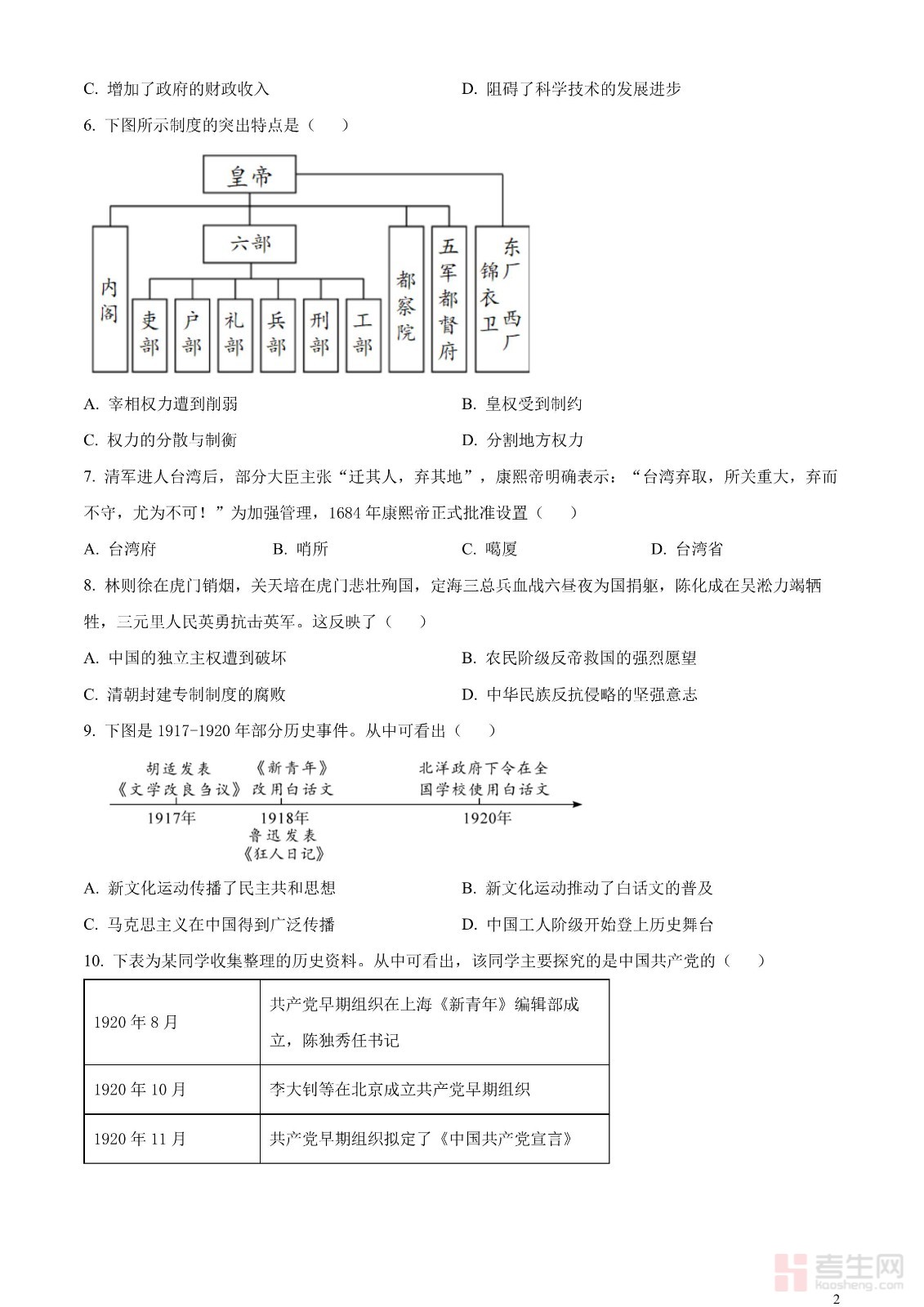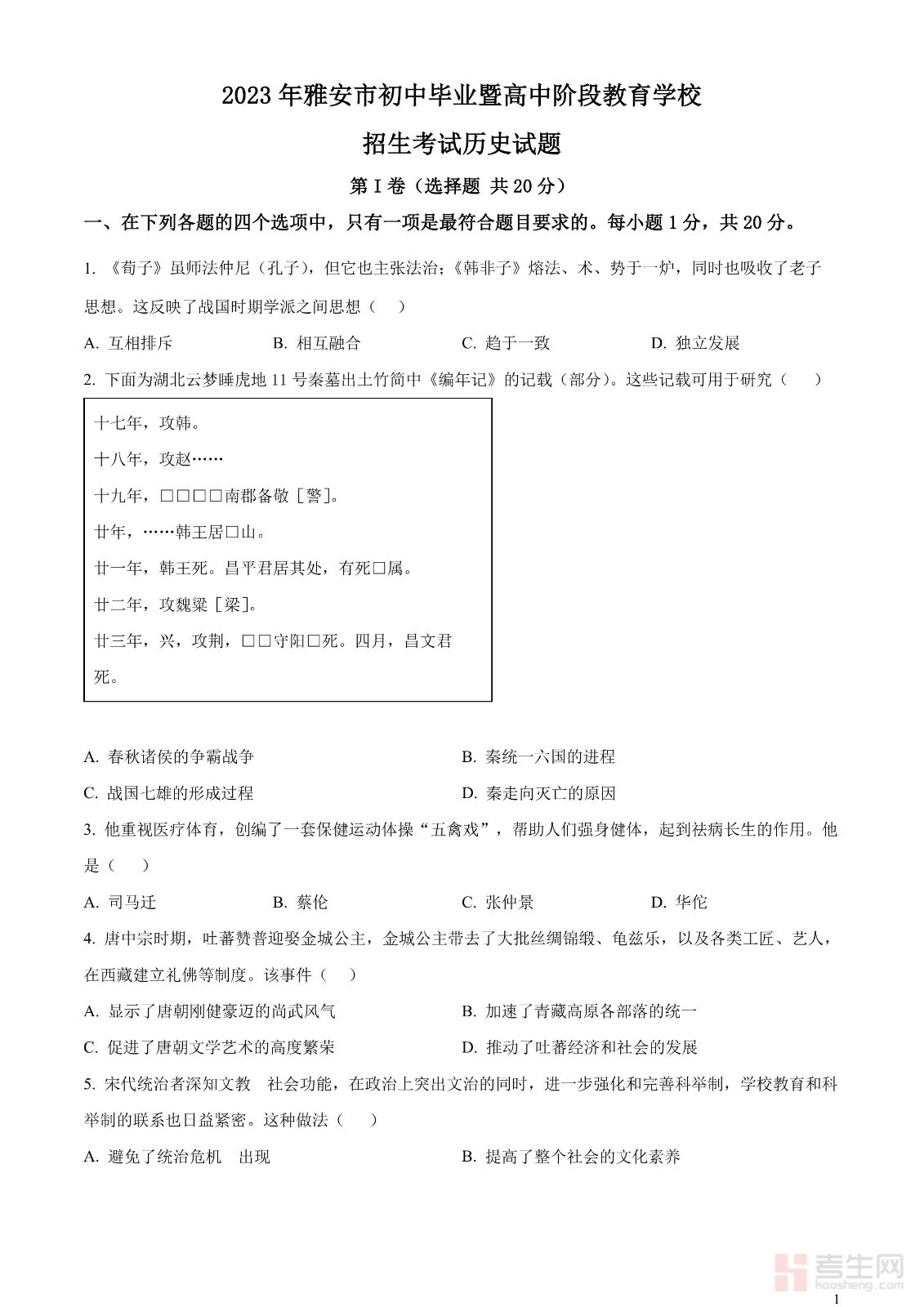 2023年四川省雅安市中考历史真题(原卷版)