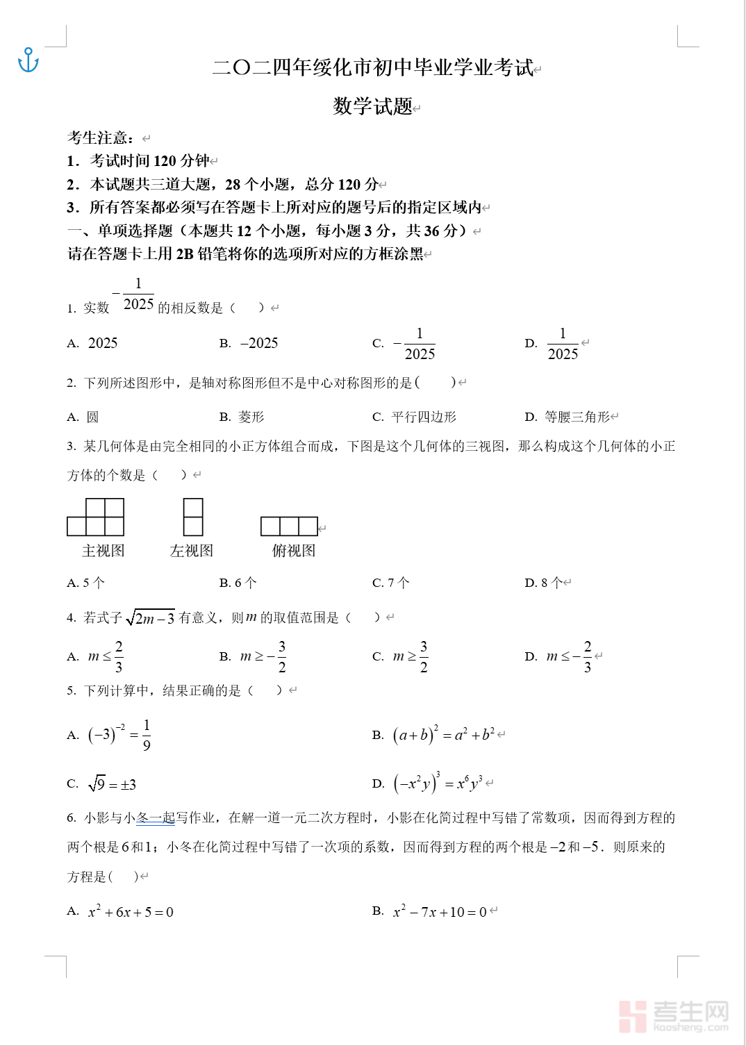 二〇二四年绥化市初中毕业学业考试