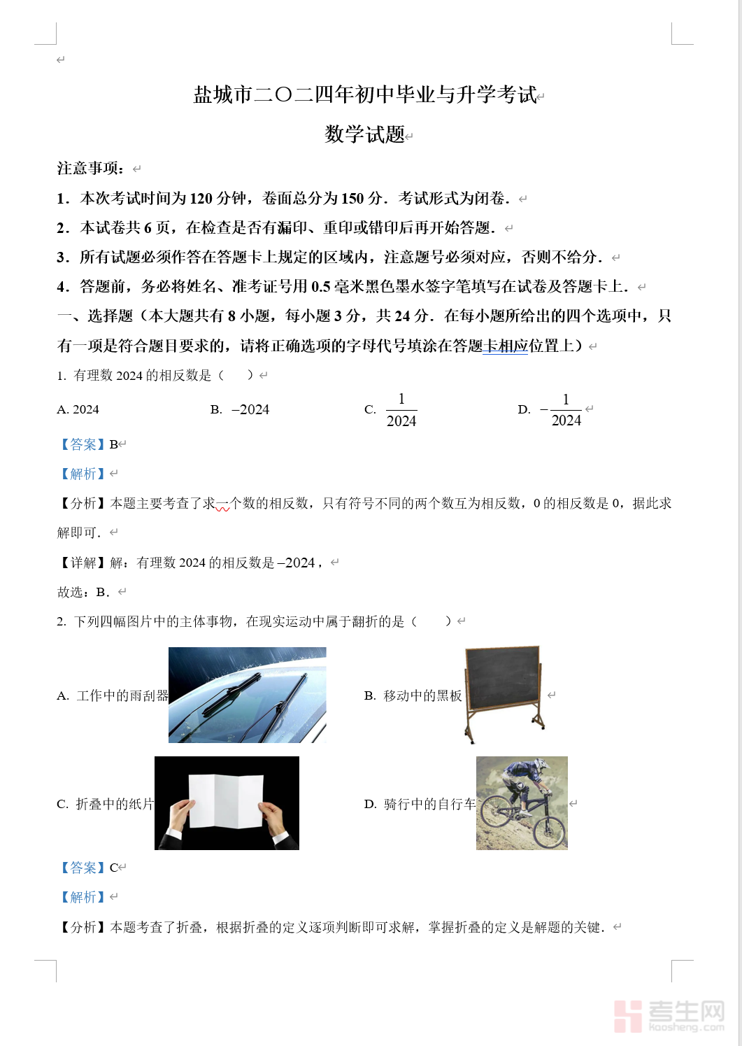 盐城市二○二四年初中毕业与升学考试