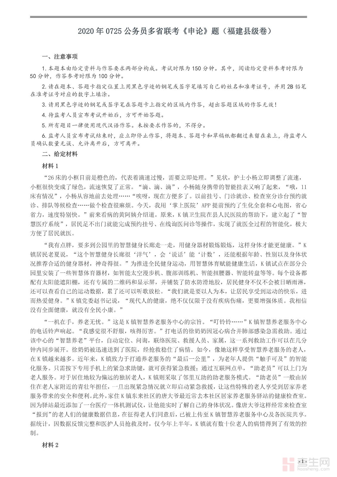 2020年0725公务员多省联考《申论》题(福建县级卷)两套答案