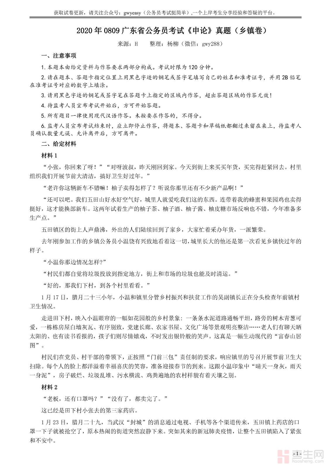 2020年0809广东省公务员考试《申论》真题(乡镇卷)参考答案及解析