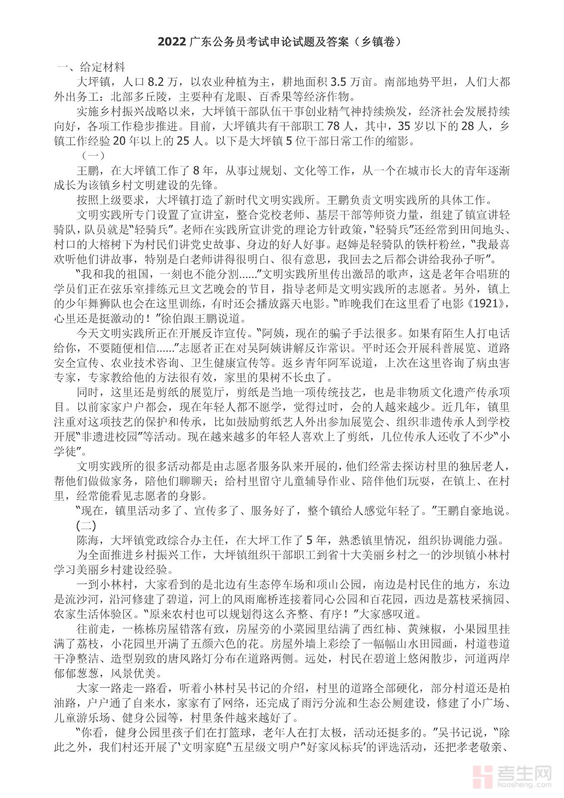 2022年广东省公务员考试申论真题及答案(乡镇卷)