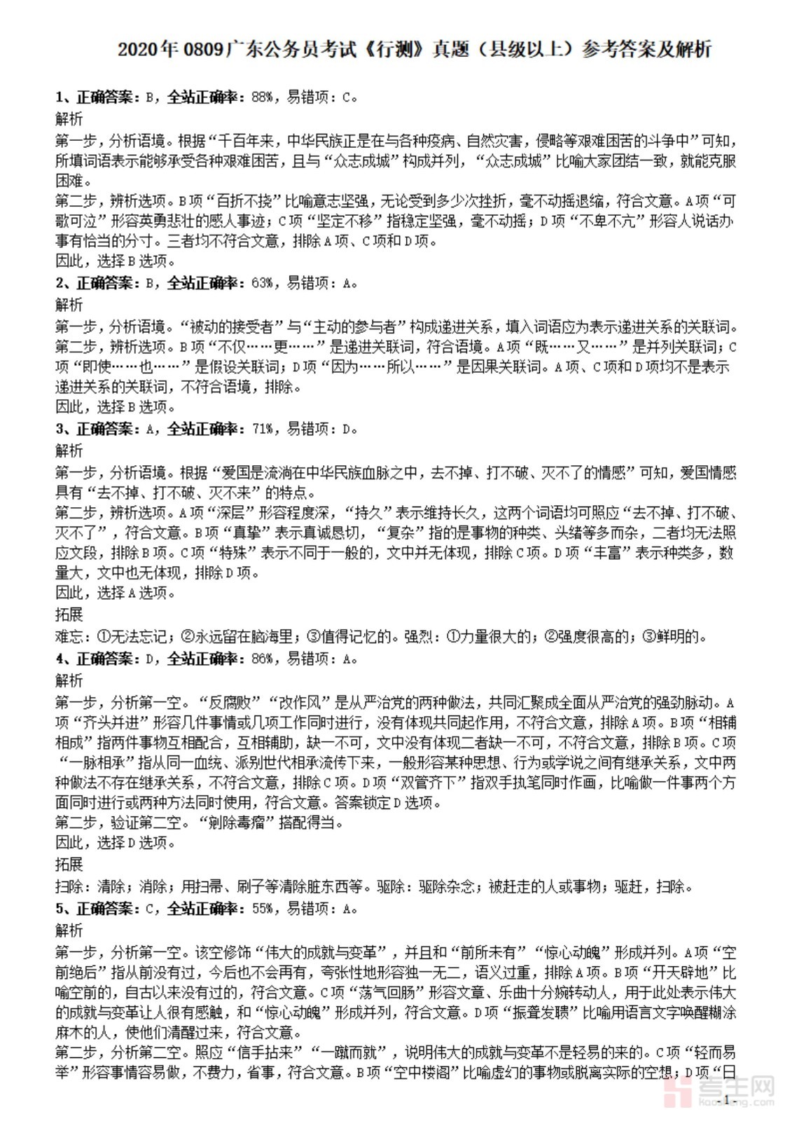 2020年0809广东公务员考试《行测》真题(县级以上)参考答案及解析