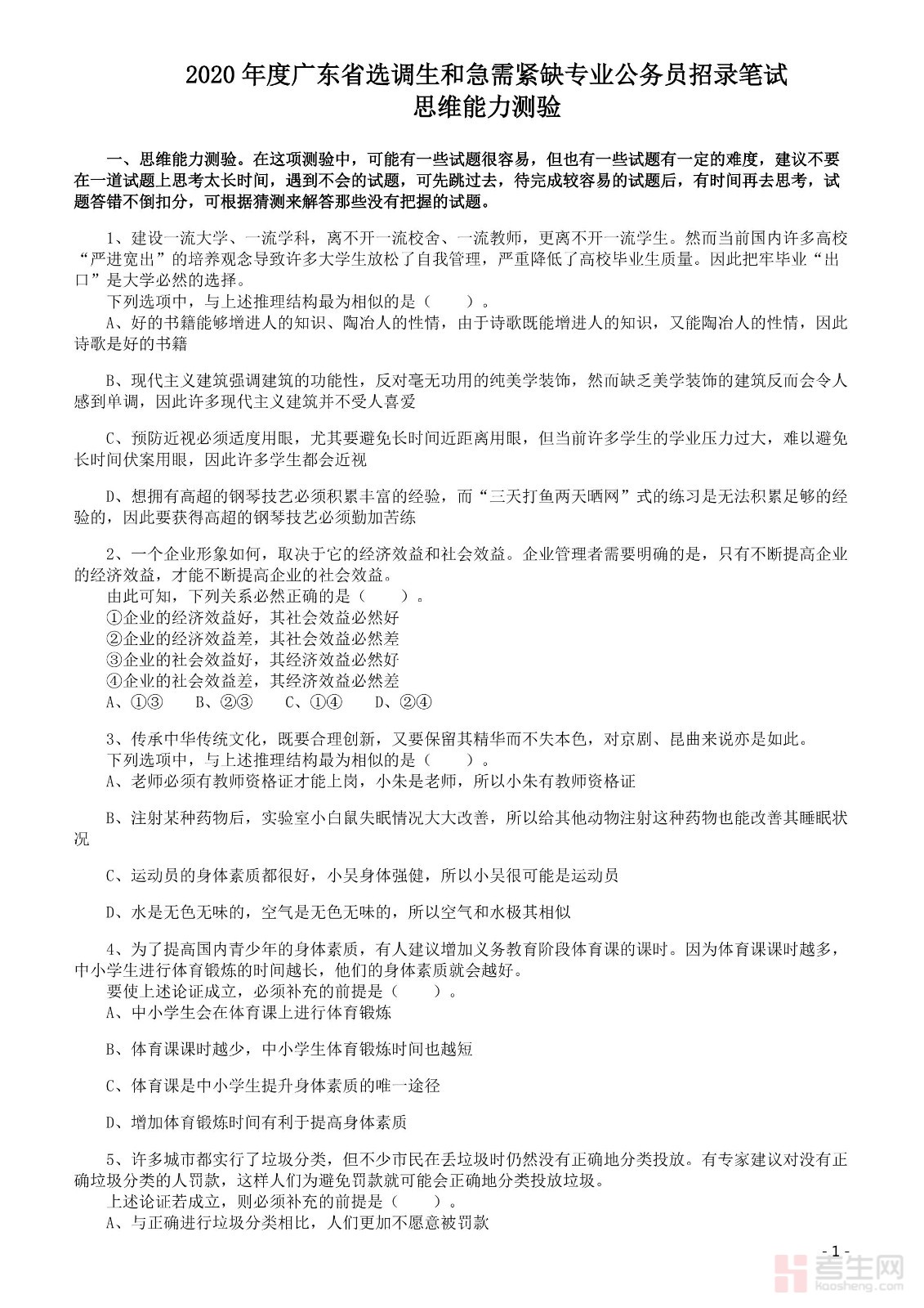2020年广东选调生和急需紧缺专业公务员招录笔试《思维能力测验》真题