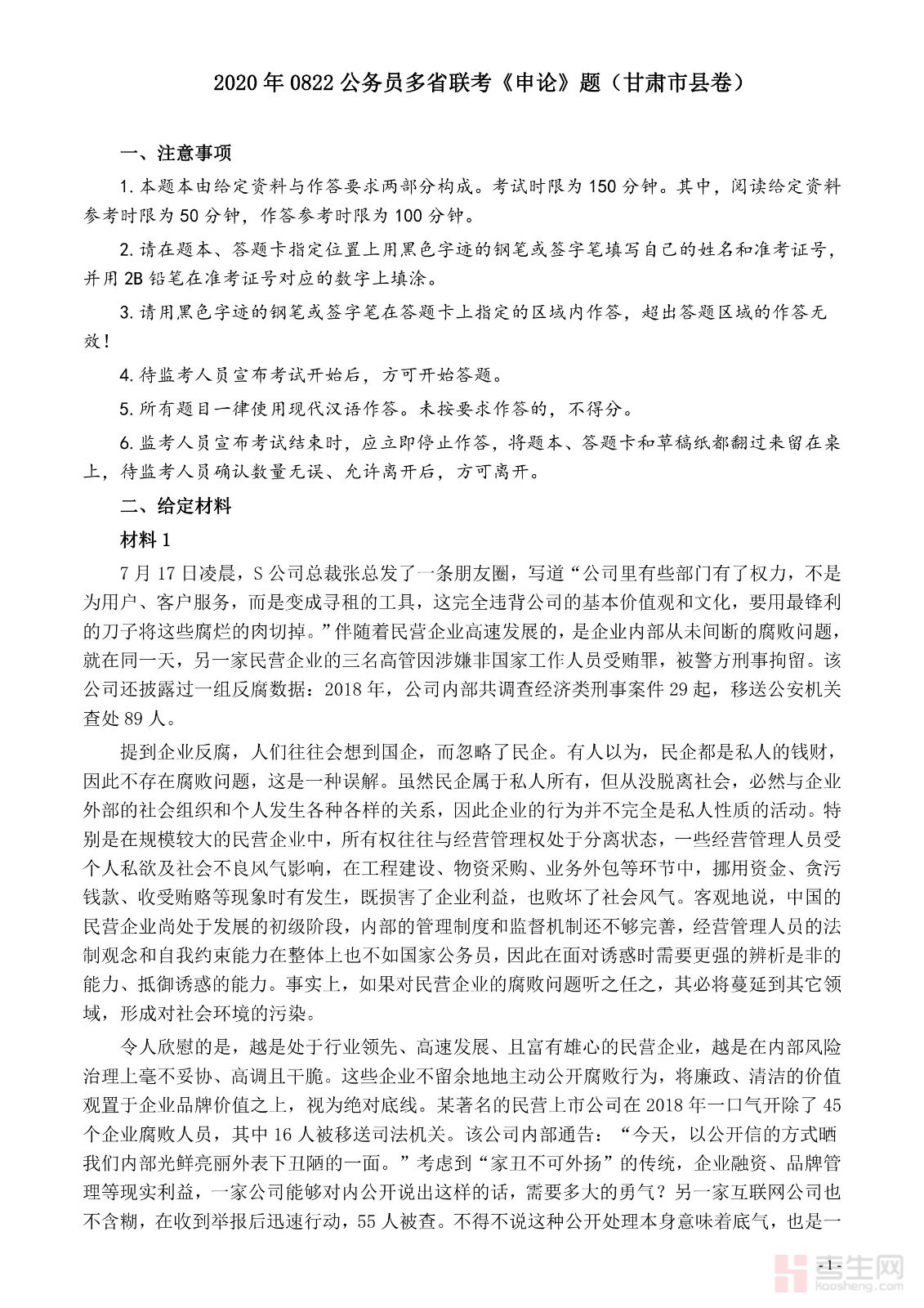2020年0822公务员多省联考《申论》题(甘肃市县卷)及参考答案