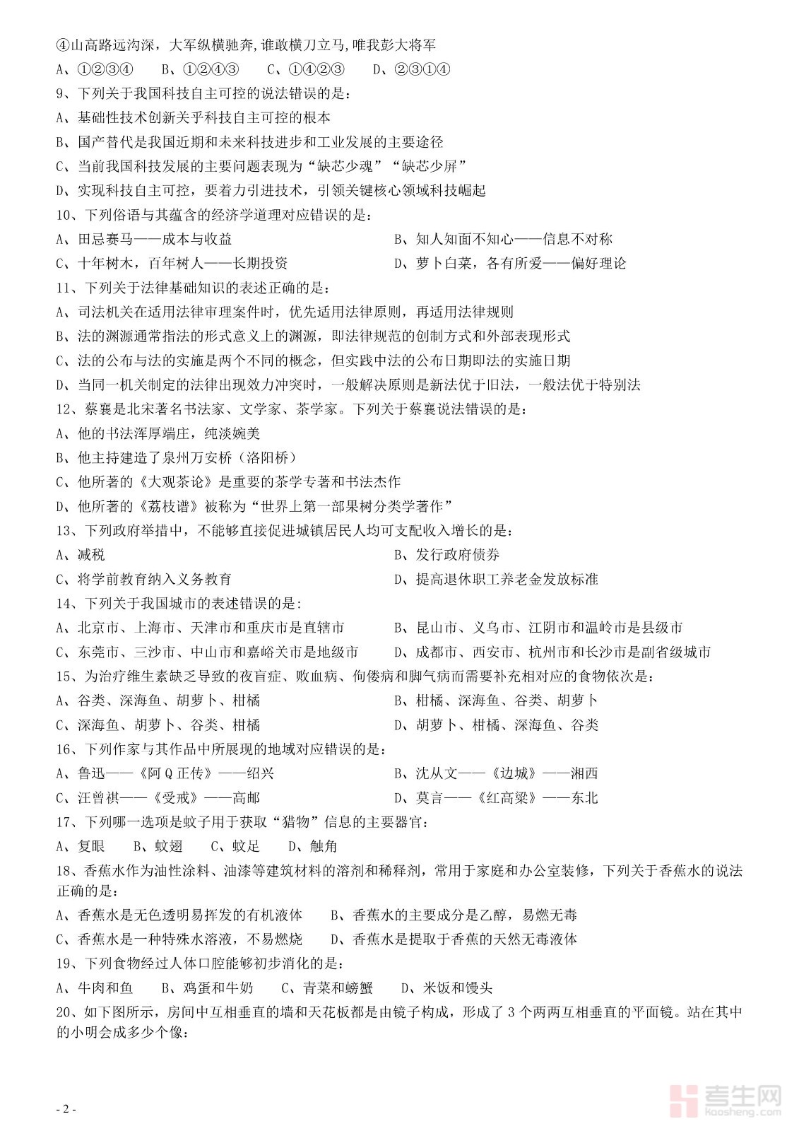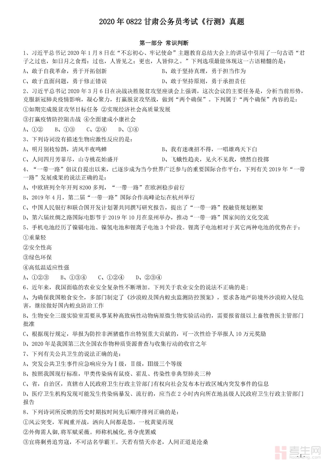 2020年0822甘肃公务员考试《行测》真题