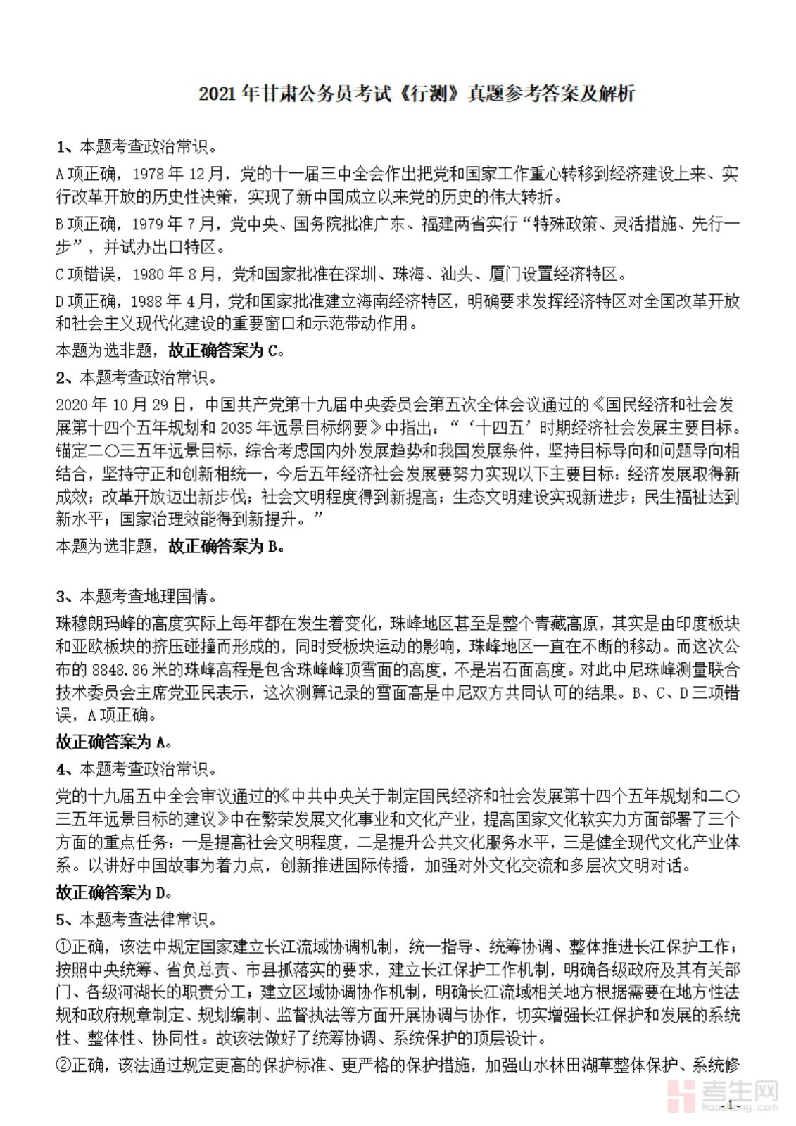 2021年甘肃公务员考试《行测》真题参考答案及解析