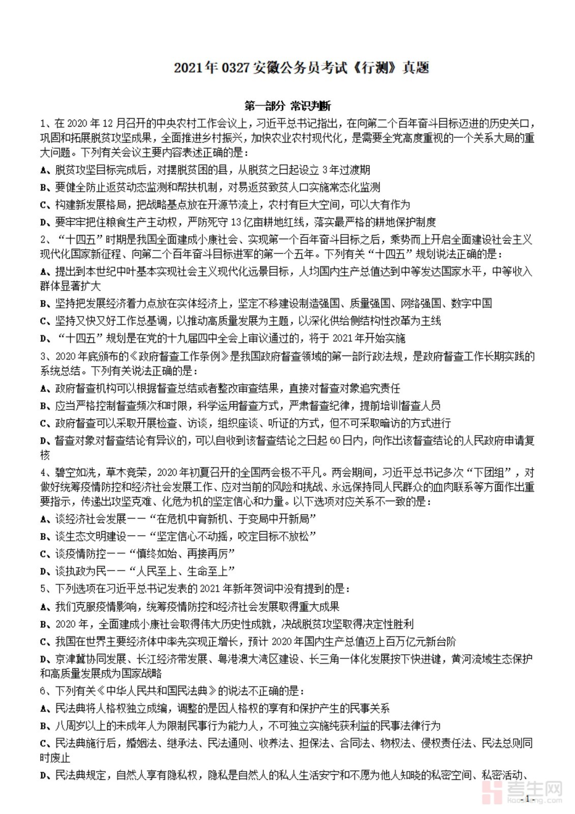 2021年0327安徽公务员考试《行测》真题