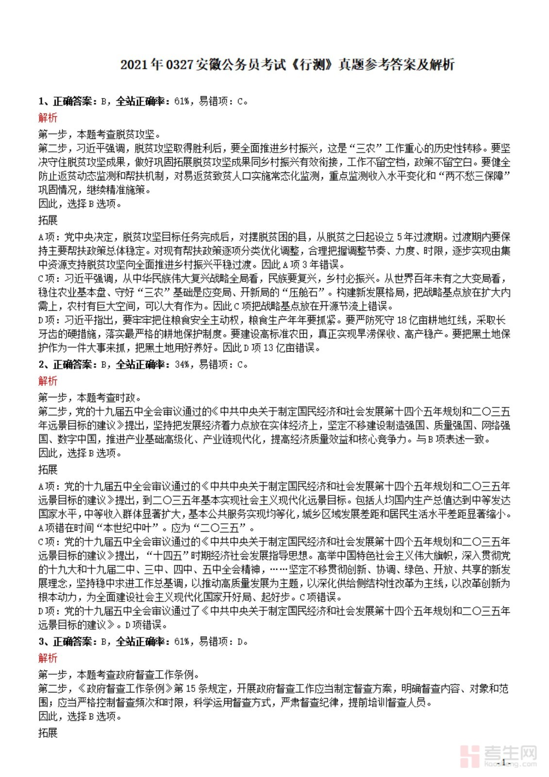 2021年0327安徽公务员考试《行测》真题参考答案及解析