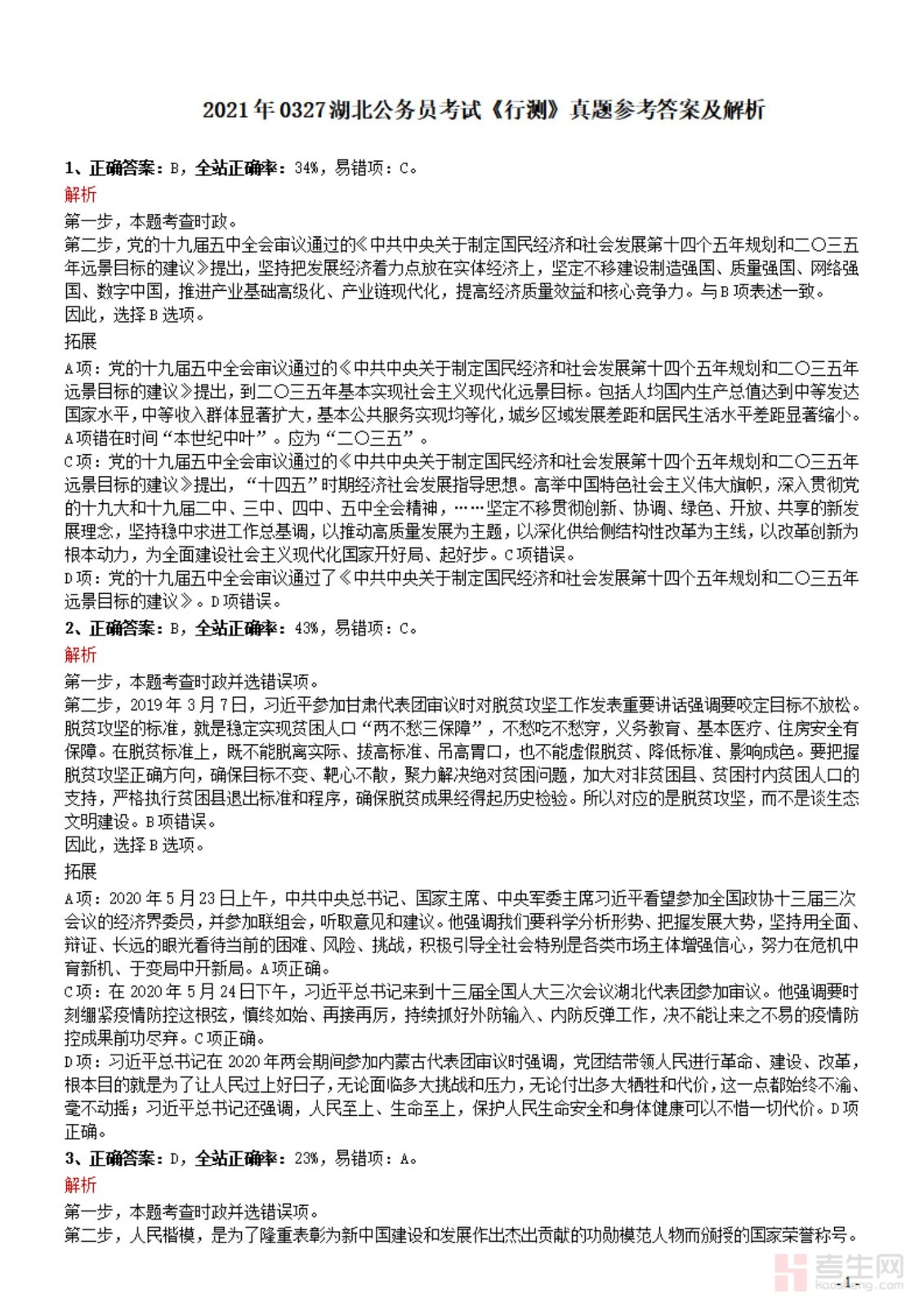 2021年0327湖北公务员考试《行测》真题参考答案及解析