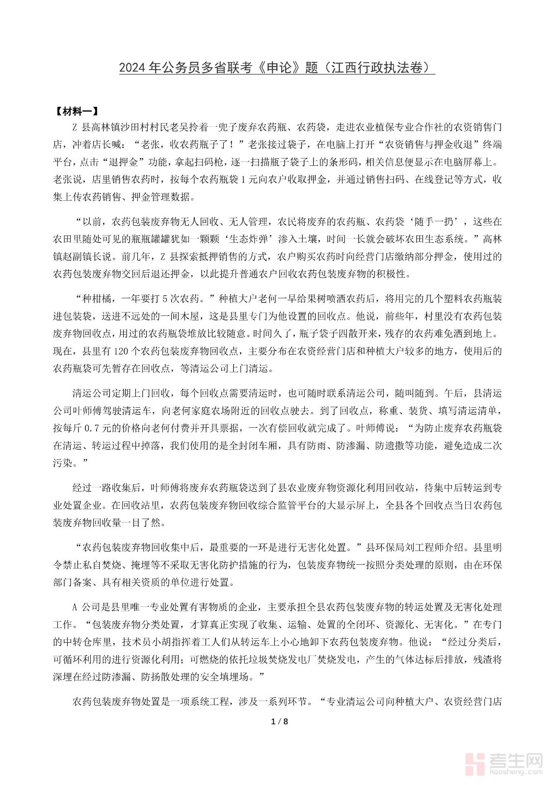 2024年公务员多省联考《申论》题(江西行政执法卷)题及参考答案