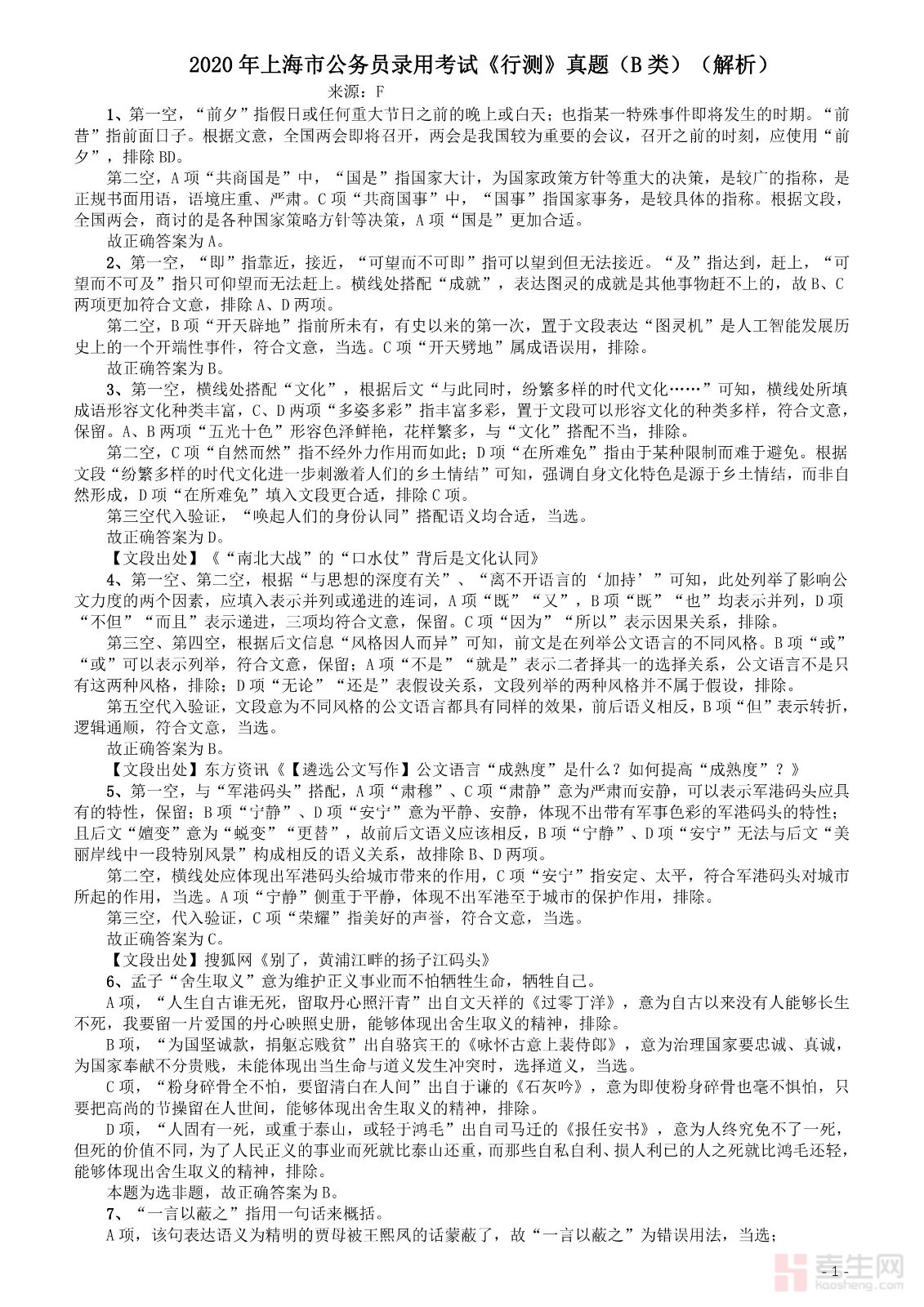 2020年上海公务员考试《行测》真题(B类)参考答案及解析