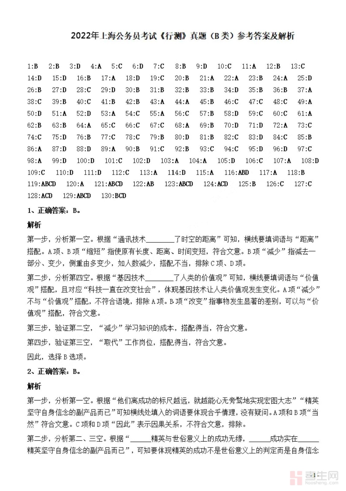 2022年上海公务员考试《行测》真题(B类)答案与解析