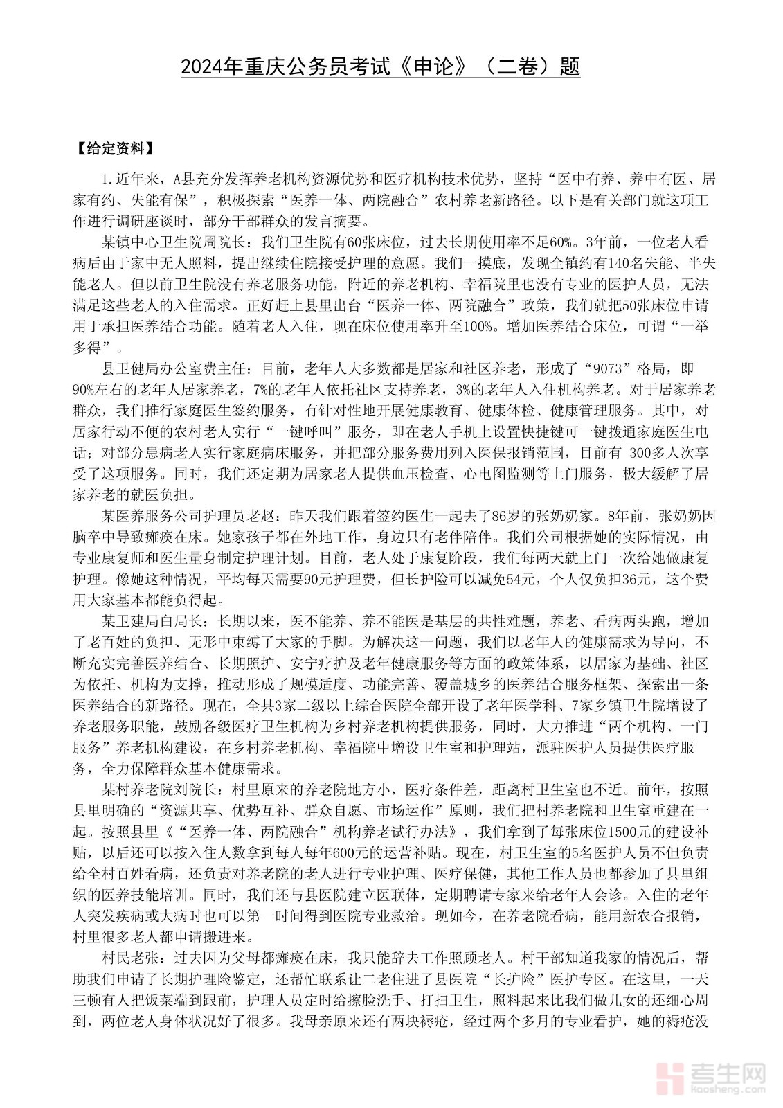 2024 年公务员重庆省考《申论》(二卷)题及参考答案