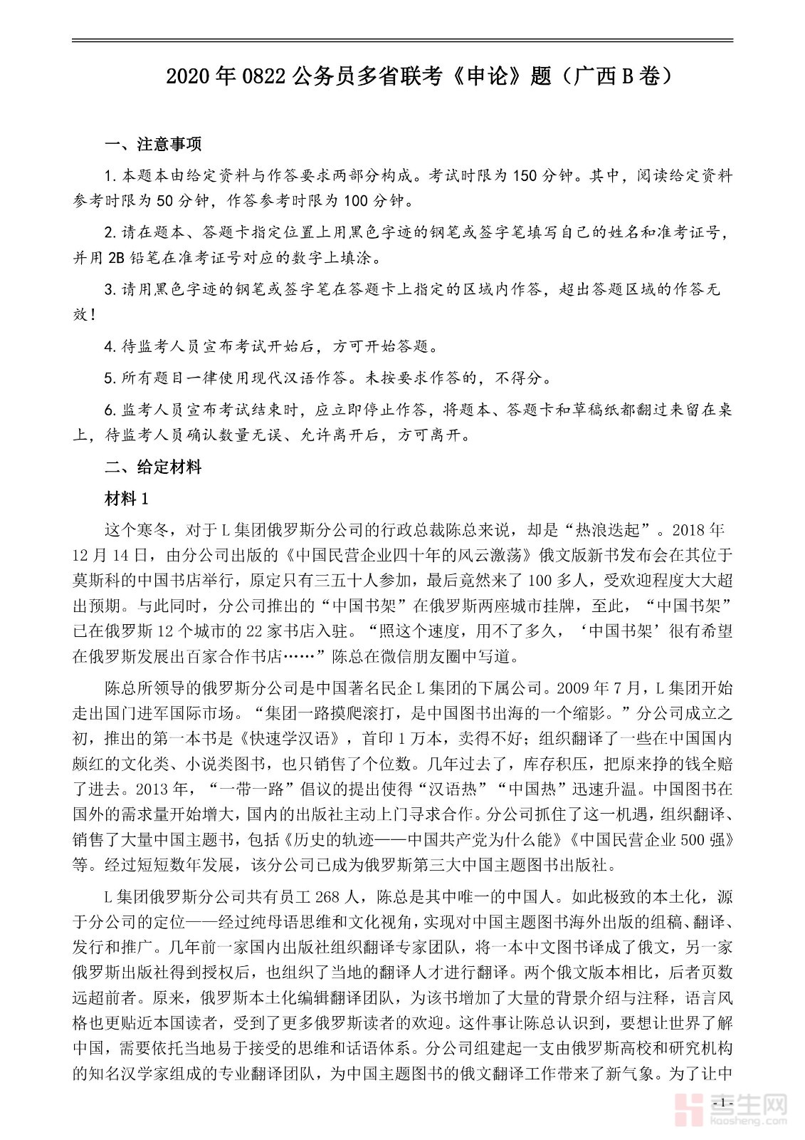 2020年0822公务员多省联考《申论》题(广西B卷)及参考答案