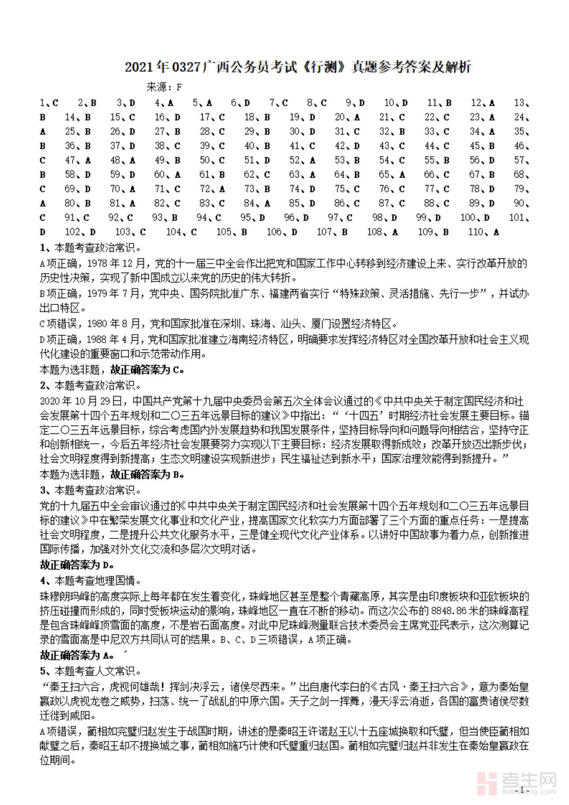 2021年0327广西公务员考试《行测》真题参考答案及解析