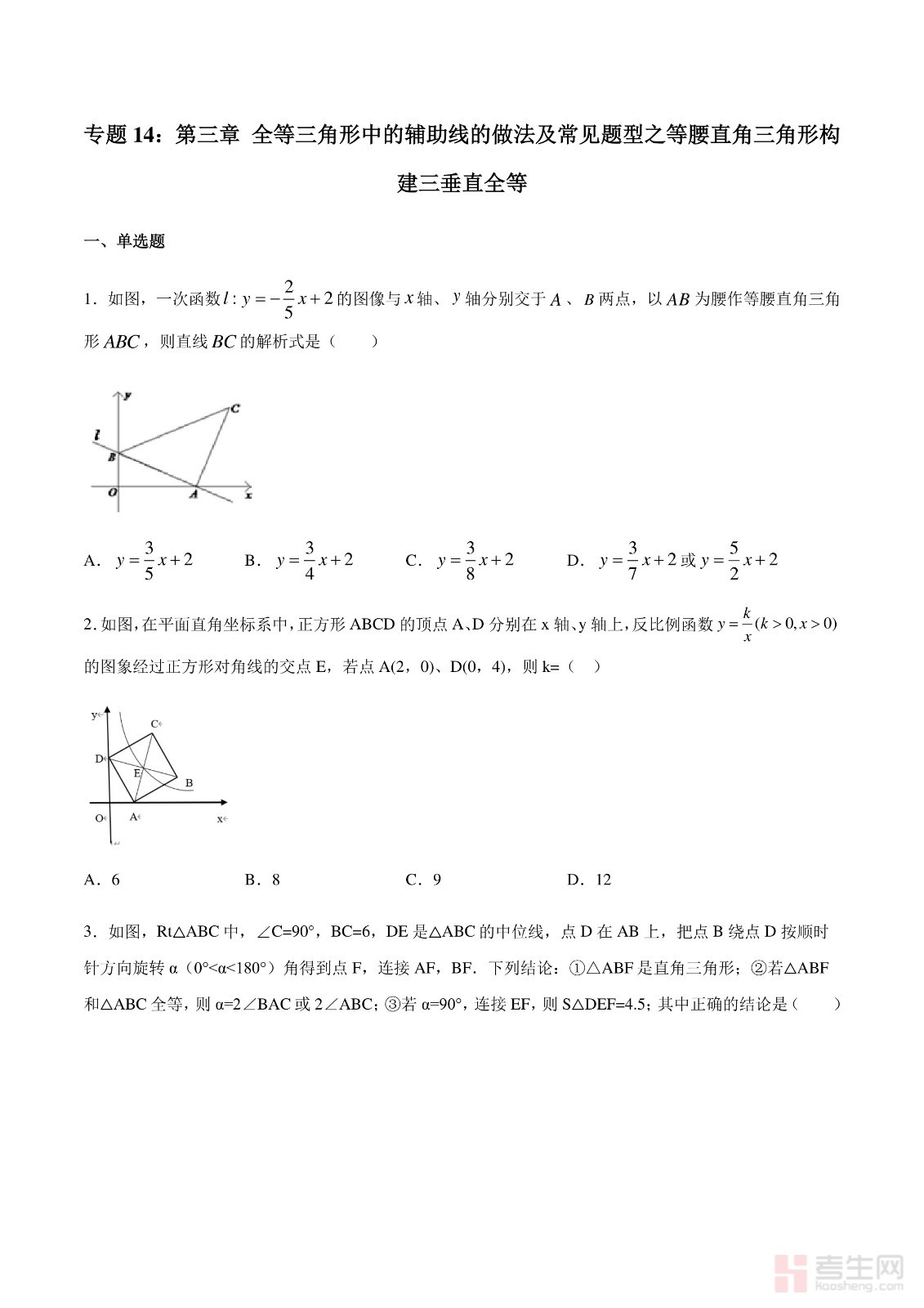 《全等三角形中的辅助线做法及常见题型之等腰直角三角形构建三垂直全等》系统训练资料,全面解析这一经典解题技巧,帮助你提升解题能力,掌握应试关键点!
