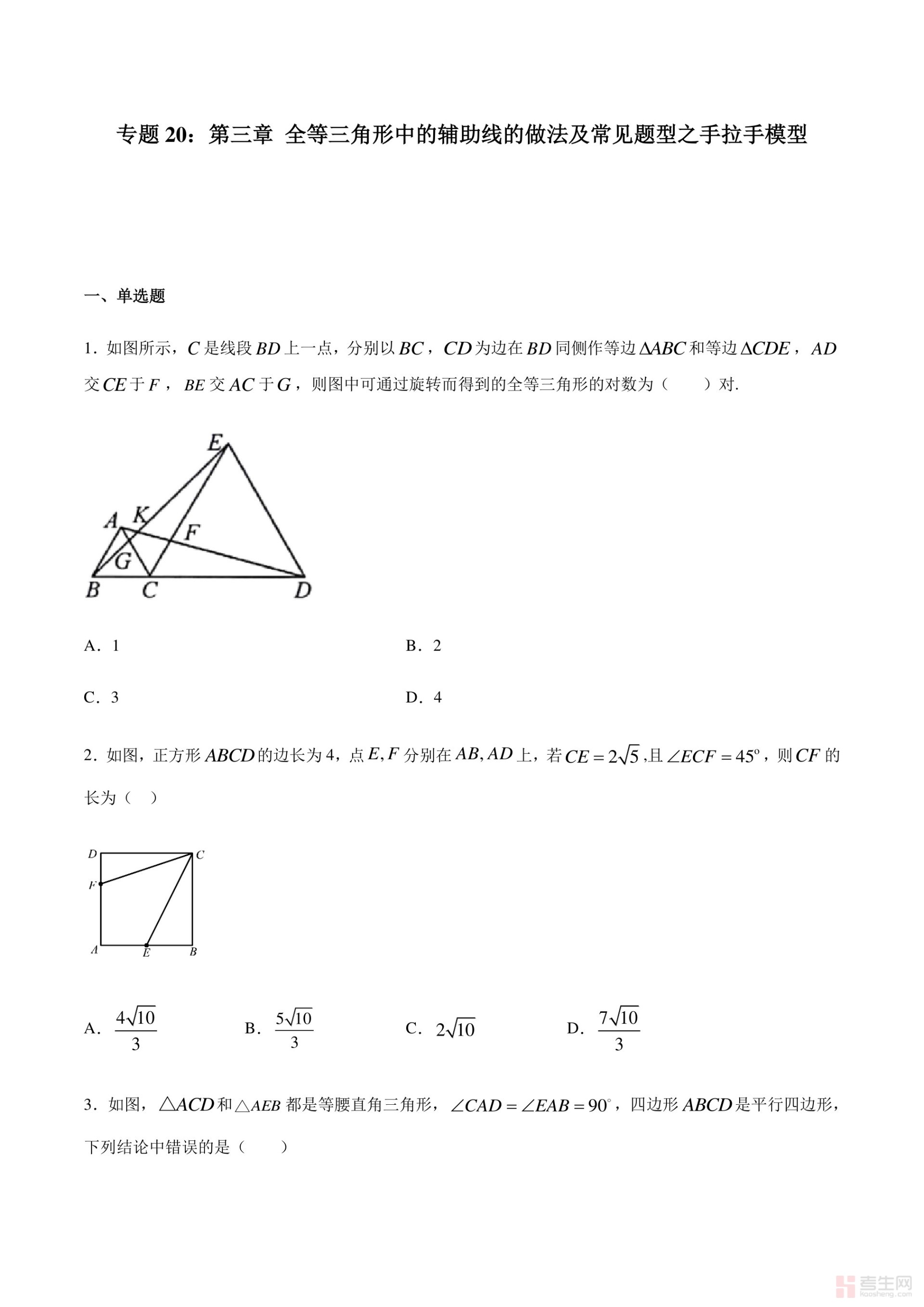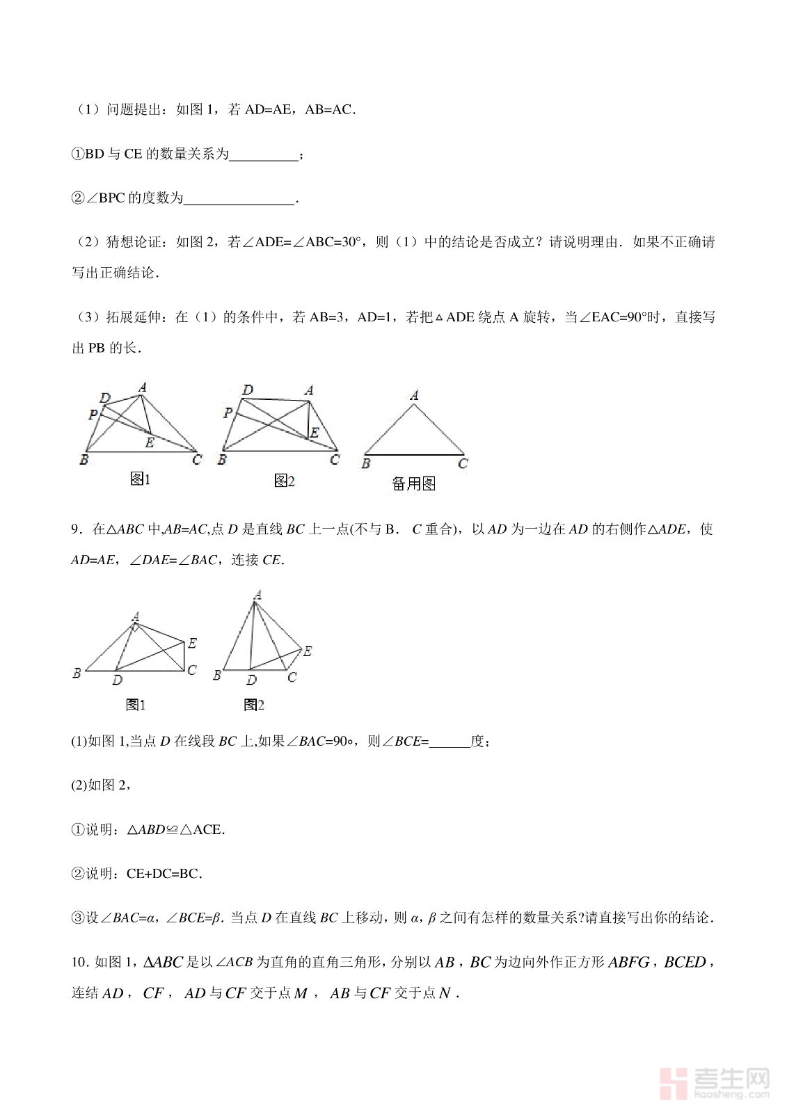 全等三角线中的辅助线做法及常见题型之手拉手模型- 中考数学解题方法系统训练(全国通用)