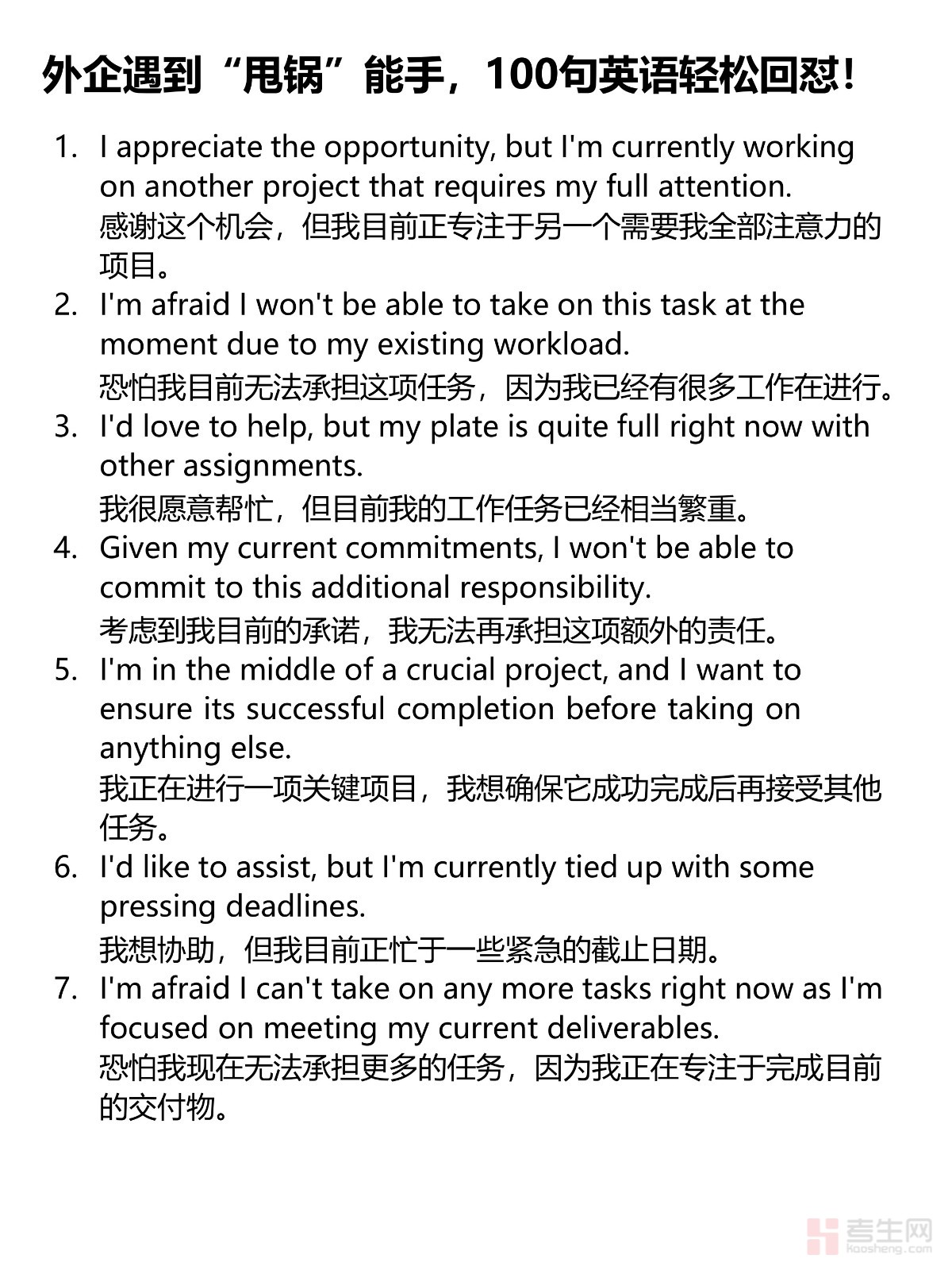 在外企工作,常常会遇到“甩锅”的情况,如何用得体又有力的英语回击,避免被动承受责任?这份【100句英语轻松回怼】为你整理了外企职场中最常见的“甩锅”情境,帮你巧妙回应,维护自己的职业形象,提升职场沟通技巧!