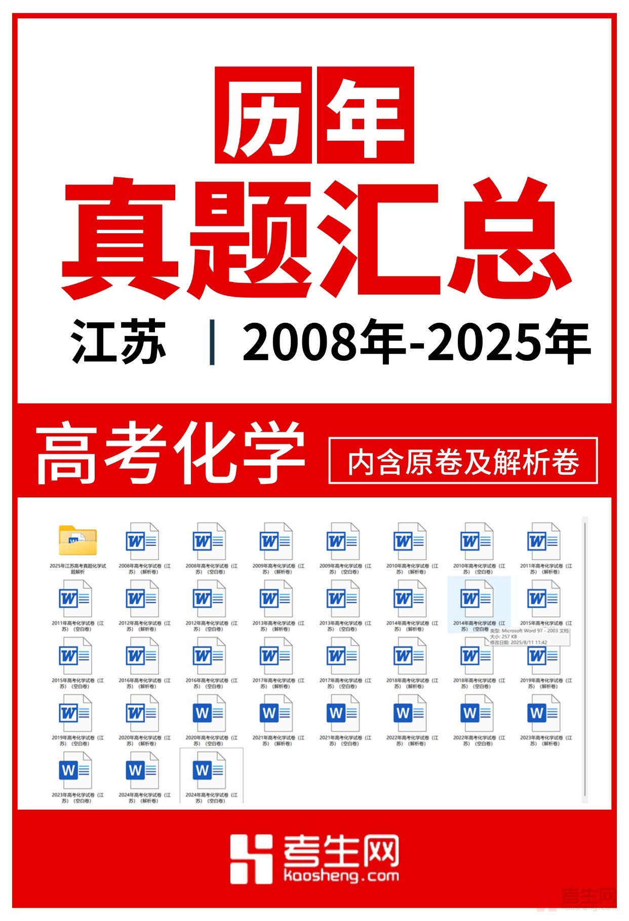 掌握江苏高考化学真题的规律,你就掌握了高分的密码!这份《江苏高考化学历年真题汇总(2008-2025)》,是你冲刺化学高分的 “王牌资料”,现在就来考生网领取,开启高效备考之路吧!