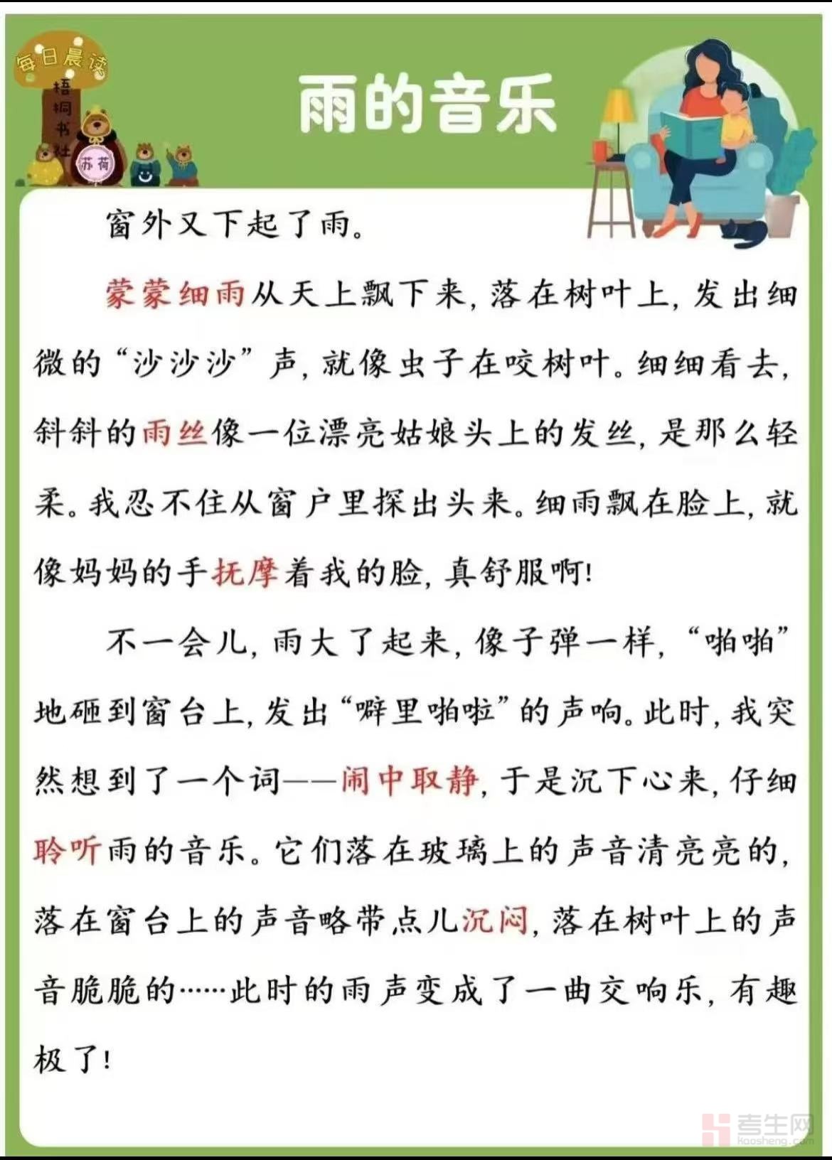 别再错过这份能带你聆听 “雨的音乐” 的优质资料!现在就登录考生网,下载《雨的音乐》晨读 + 练笔资料,让每一个清晨都有雨之韵律相伴,让每一次练笔都成为记录生活、提升自我的宝贵印记!