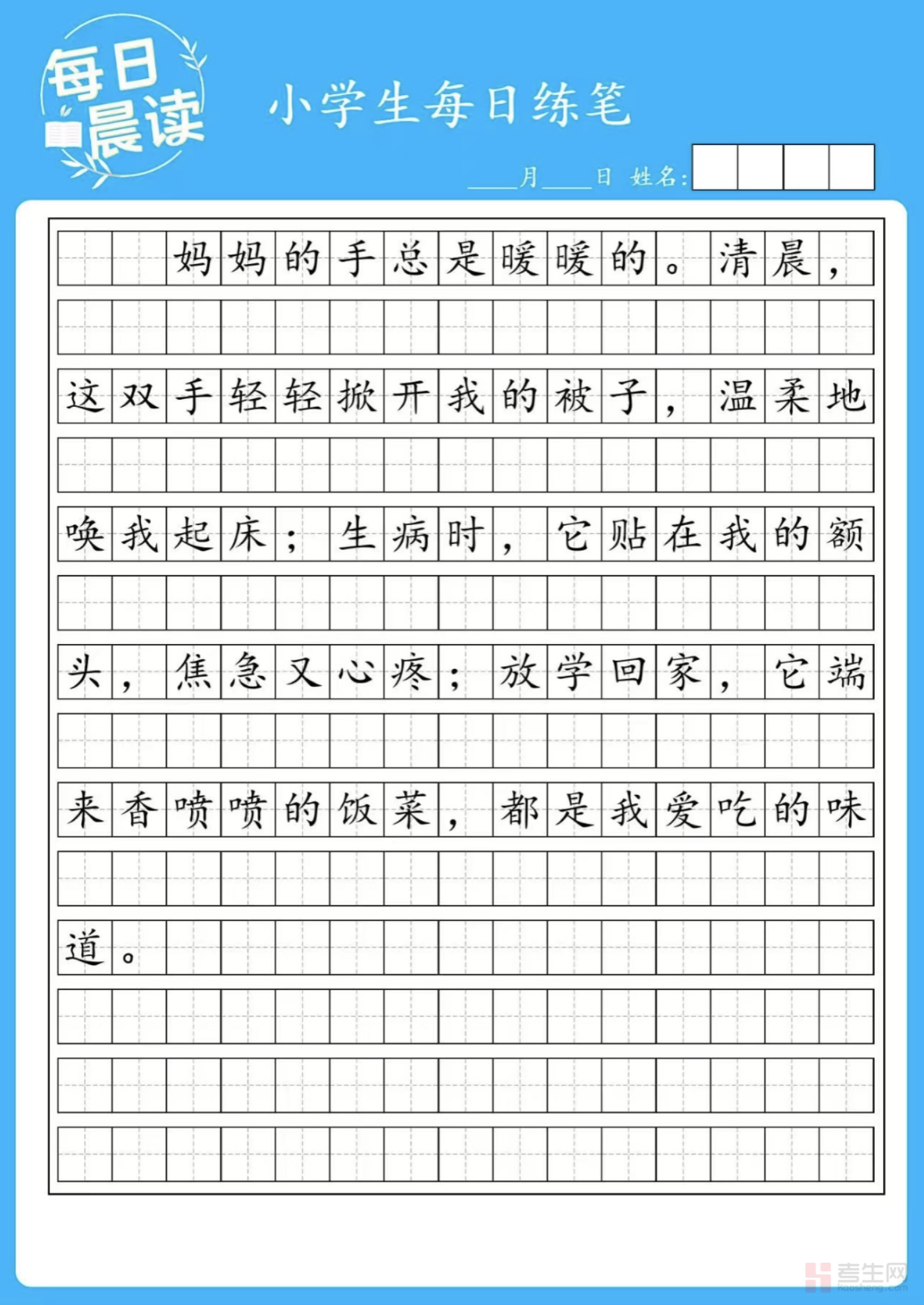 更便捷的是,资料已上传至考生网,下载路径简单便捷:登录考生网,搜索 “《妈妈的手》晨读 + 练笔资料”,即可一键获取。你可以在清晨伴着晨光,品读文中 “妈妈的手” 的故事,唤醒一天的温暖;也可以在闲暇时光,回忆与妈妈的点滴,完成练笔题目,将心底对妈妈的爱付诸文字。坚持每日阅读与练习,不仅能显著提升文字表达能力,更能让你学会用心感受亲情细节,让写作成为传递爱、记录温暖的美好方式。