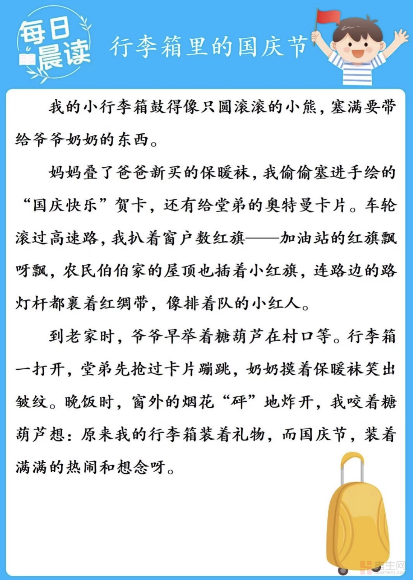 别再错过这份满含节日情怀的优质资料!现在就登录考生网,下载《行李箱里的国庆节》晨读 + 练笔资料,让每一个行李箱都成为故事的载体,让每一次练笔都成为对国庆节的深情告白!