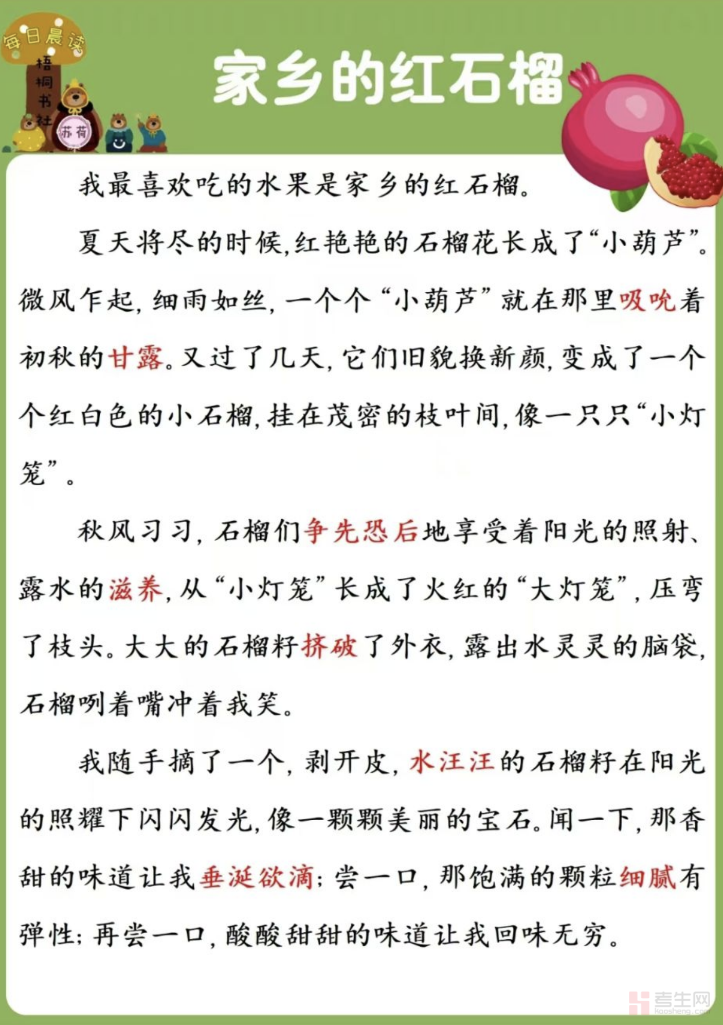 别再错过这份满含乡土温情的优质资料!现在就登录考生网,下载《家乡的红石榴》晨读 + 练笔资料,让每一颗红石榴都成为乡愁的信使,让每一次练笔都成为对家乡的深情告白!