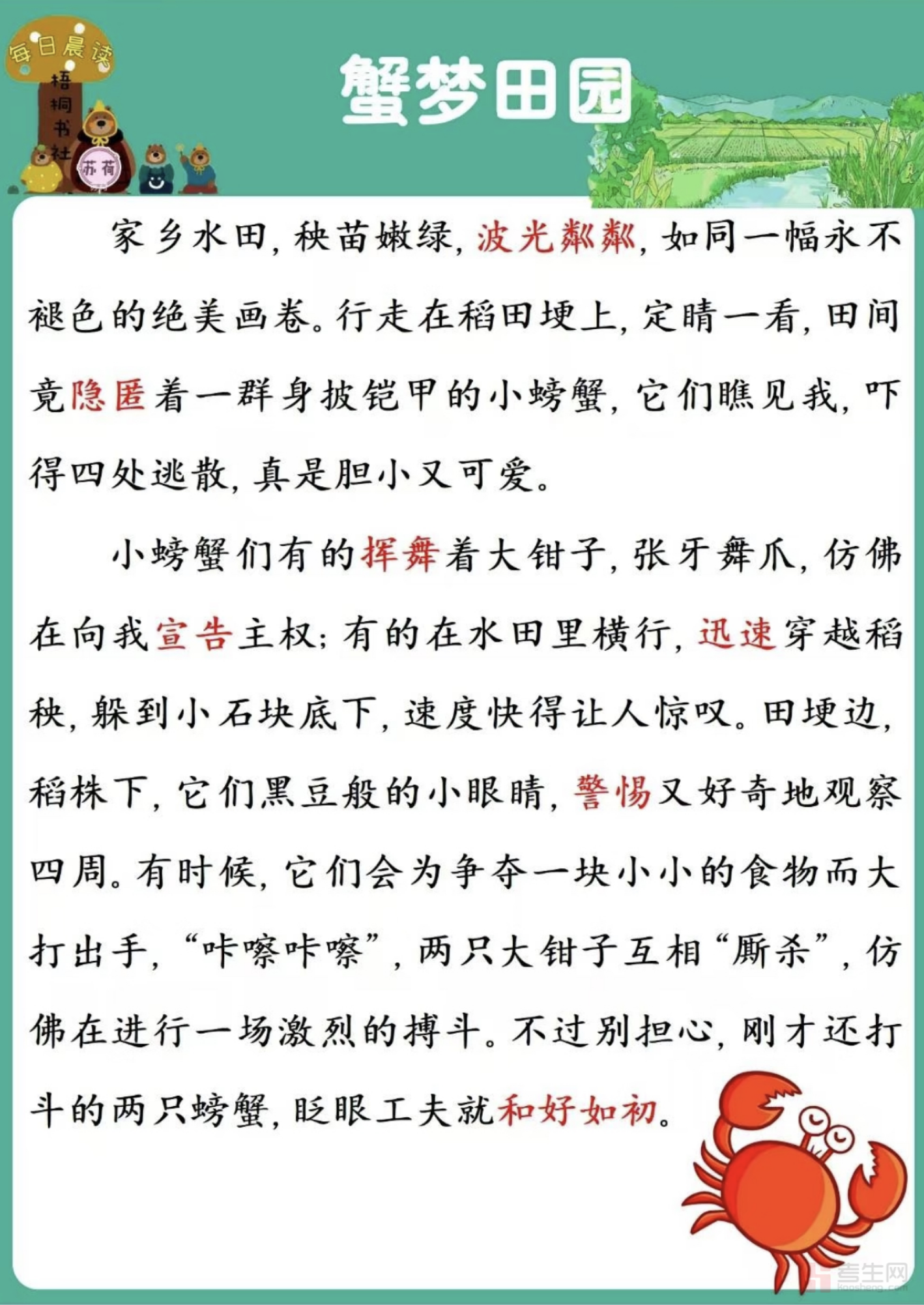 别再错过这份满含田园诗意的优质资料!现在就登录考生网,下载《蟹梦田园》晨读 + 练笔资料,让每一段文字都盛满田园的蟹趣,让每一次练笔都成为与自然的温柔邂逅!