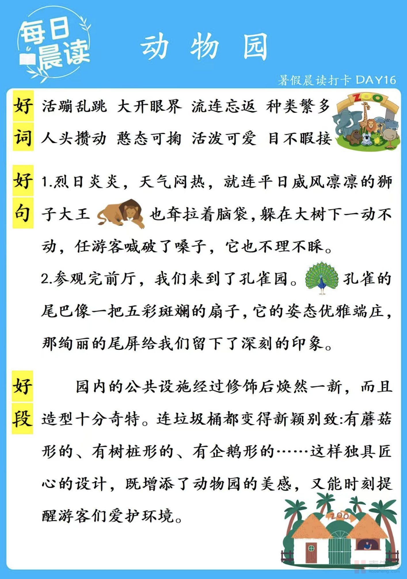 这份资料以 “动物园” 为核心,将动物的鲜活姿态与游客的情感体验紧密融合,既是晨读时唤醒童真记忆的 “治愈读本”,也是练笔时激发创作灵感的 “素材宝库”。在晨读部分,文字围绕 “动物园” 展开多维度刻画,让每一幅萌趣画面都鲜活可感:清晨的动物园,是 “充满生机的苏醒”—— 饲养员推着食物车穿梭在园区,熊猫慢悠悠地从竹笋堆里抬起头,金丝猴在树枝间灵活跳跃,仿佛在迎接新一天的游客;白天的动物园,是 “热闹非凡的奇妙场”—— 熊猫馆前总是排着长队,大家举着手机记录熊猫啃竹、打滚的憨态,偶尔熊猫抬头望一眼,就能引来一阵欢呼;猴山旁满是孩子的笑声,小猴子抢过游客递来的水果(合规投喂),眨眼间就窜到树梢大快朵颐;孔雀园里,雄孔雀展开五彩斑斓的尾屏,在阳光下泛着金属光泽,仿佛在向游客展示自己的美丽;傍晚的动物园,是 “静谧温柔的收尾”—— 夕阳为动物场馆镀上金边,长颈鹿缓缓踱步回棚舍,水豚趴在池塘边享受最后的暖阳,游客们带着满满的照片与回忆,依依不舍地向动物们告别。文字中还融入了动物园的生活细节:孩子趴在围栏边认真观察动物的专注神情、家长轻声讲解动物习性的温柔语气、志愿者科普保护动物知识的耐心模样,这些场景不仅能让你在晨读时积累 “自然”“童真”“生命” 主题的写作素材,学习 “动静结合”“细节描写” 的手法,更能唤醒你对动物园的记忆与共鸣,感受人与动物和谐相处的美好。