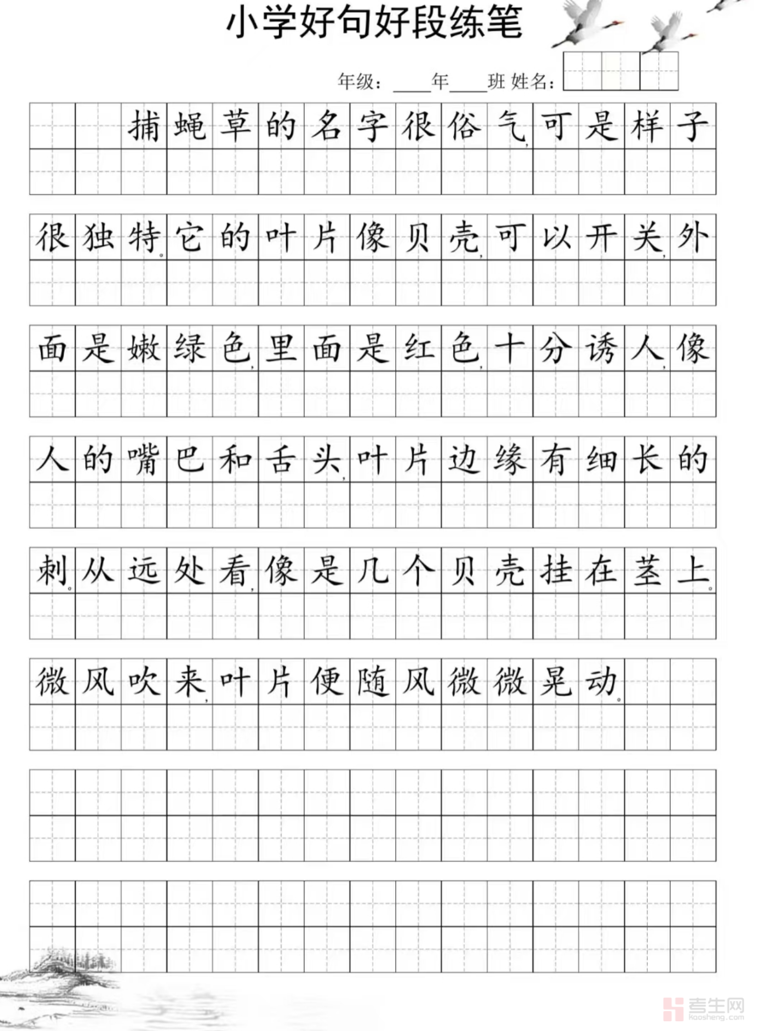 别再错过这份满含自然奥秘与趣味的优质资料!现在就登录考生网,下载《捕蝇草》晨读 + 练笔资料,让每一段文字都盛满食虫植物的神奇,让每一次练笔都成为与自然奥秘的温柔邂逅!