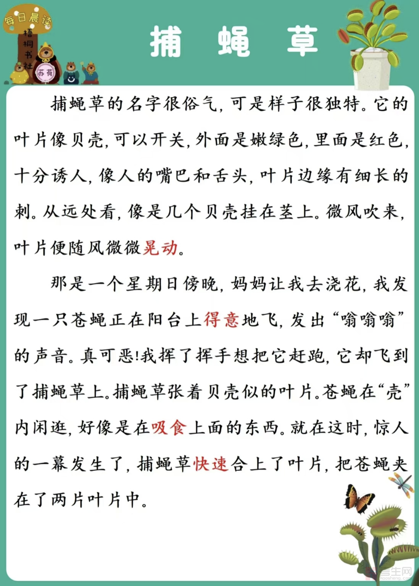 文字中还融入了关于捕蝇草的细腻细节:刚长出的新叶呈嫩绿色,“捕虫夹” 尚未完全成熟;捕食后叶片会因消化过程微微鼓起;冬季低温时它会进入休眠,叶片暂时枯萎,待春天重新萌发,这些细节不仅能让你在晨读时积累 “自然科普”“植物观察” 主题的写作素材,学习 “动态描写”“细节刻画” 的手法,更能唤醒你对小众植物的关注,感受大自然的多样与奇妙。