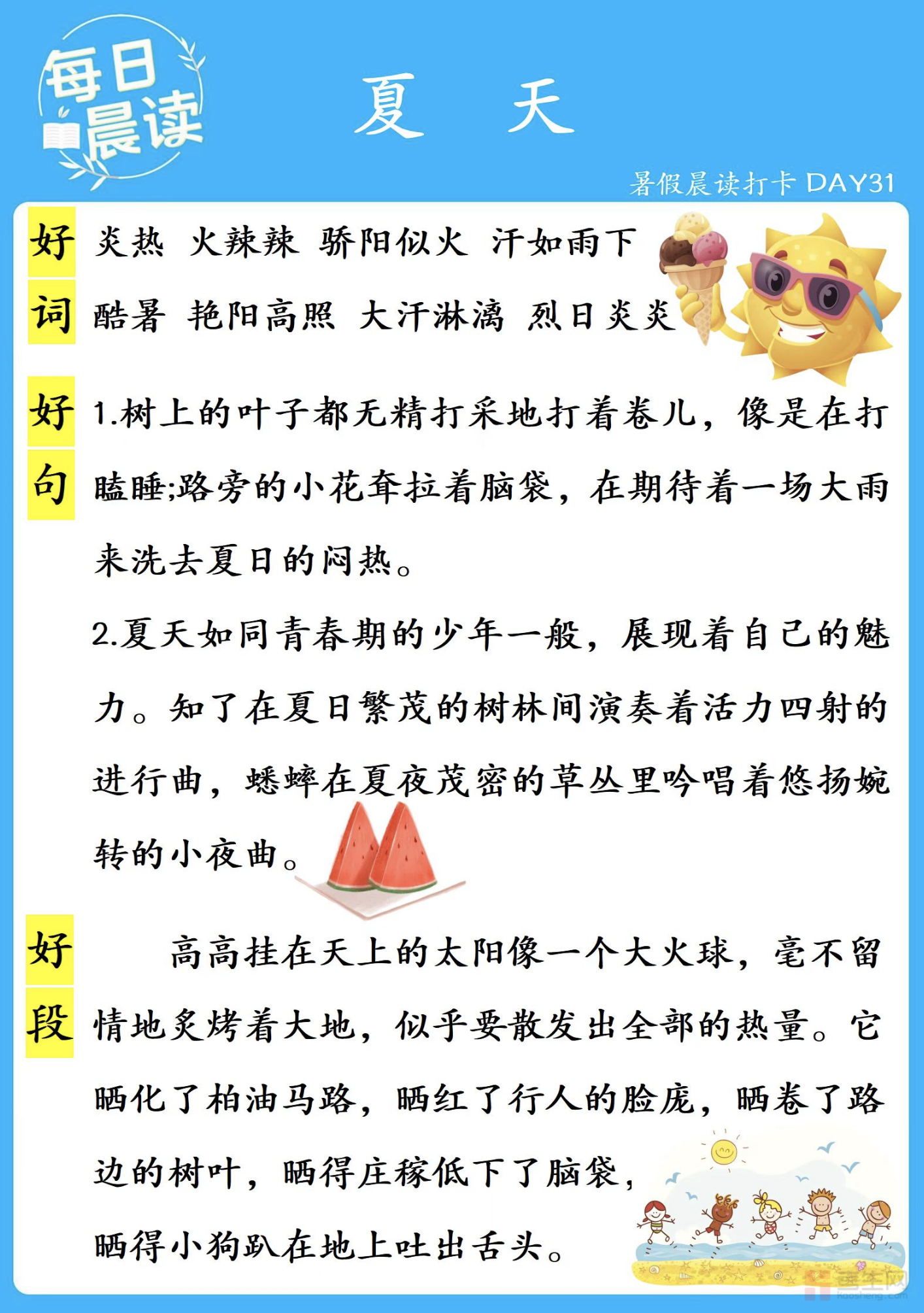 文字中还融入了夏天的细腻细节:雪糕融化后滴在手上的冰凉触感、雨滴落在荷叶上滚动的晶莹模样、晚风吹动裙摆的轻柔感觉、萤火虫在指尖飞过的微弱光亮,这些场景不仅能让你在晨读时积累 “季节”“生活”“情感” 主题的写作素材,学习 “感官描写”“动静结合” 的手法,更能唤醒你对夏天的记忆与共鸣,感受盛夏的热烈与美好。