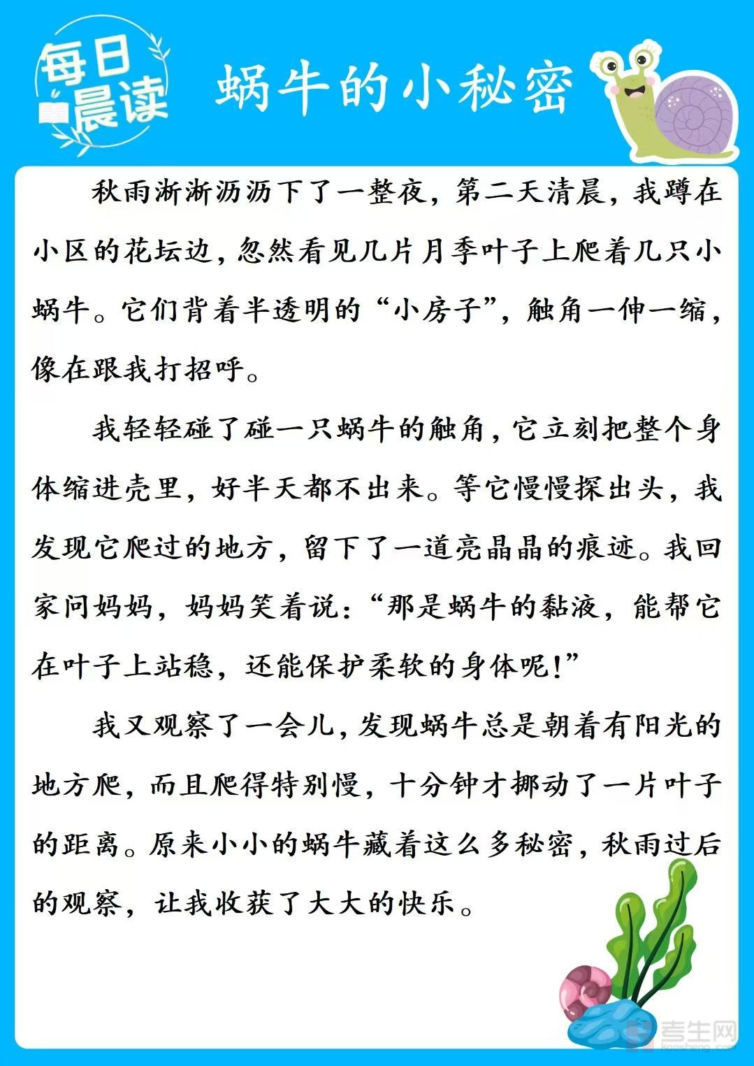别再错过这份满含自然奥秘与观察趣味的优质资料!现在就登录考生网,下载《蜗牛的小秘密》晨读 + 练笔资料,让每一段文字都盛满小生灵的奇妙,让每一次练笔都成为与自然奥秘的温柔邂逅!