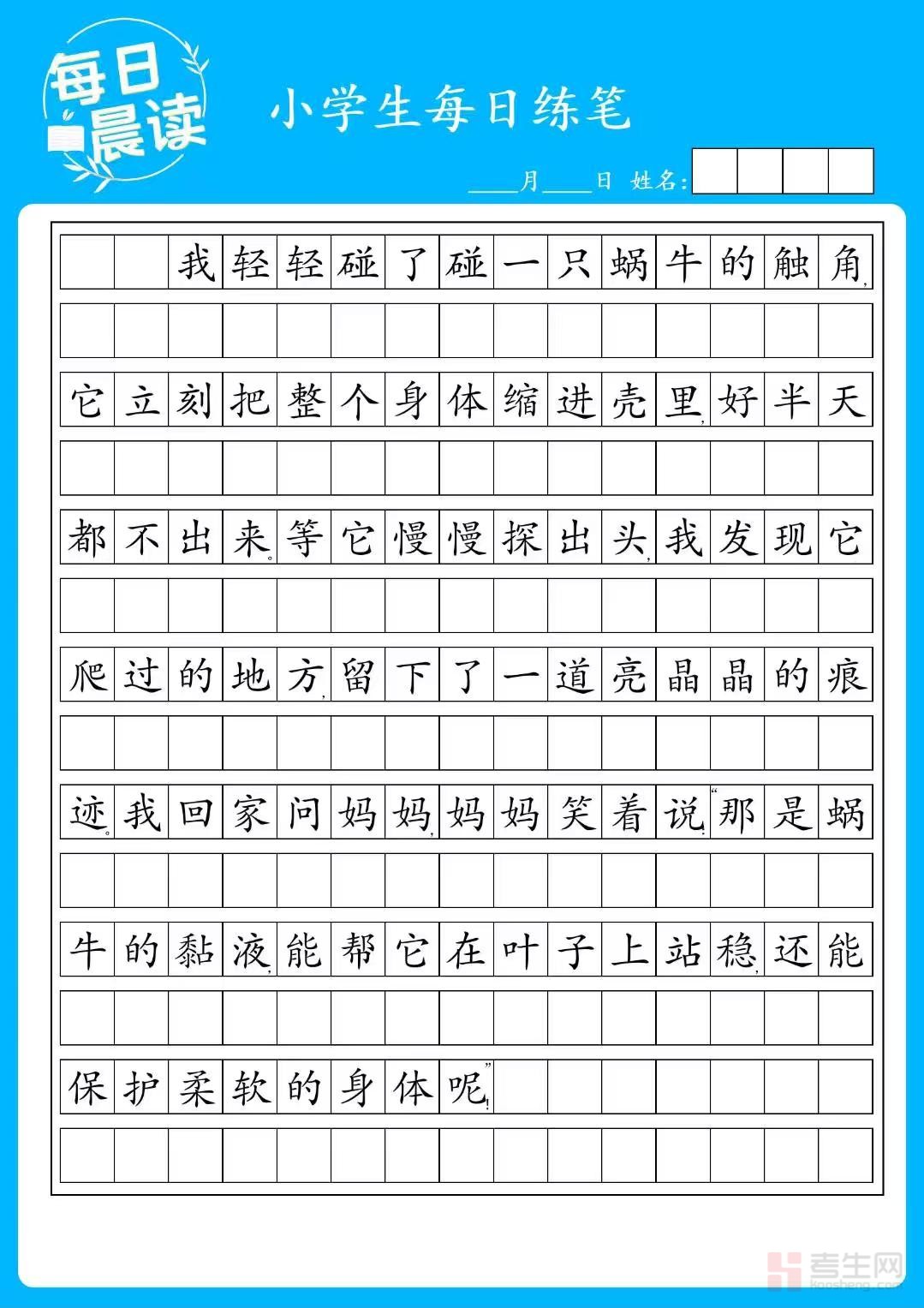 更便捷的是,资料已上传至考生网,下载路径简单便捷:登录考生网,搜索 “《蜗牛的小秘密》晨读 + 练笔资料”,即可一键获取。你可以在清晨伴着晨光,品读文中关于蜗牛的奇妙秘密,开启一天的探索欲;也可以在雨后带着放大镜观察蜗牛,结合实际体验完成练笔题目,将对这一小小生灵的认知与感受付诸文字。坚持每日阅读与练习,不仅能显著提升文字表达能力,更能让你学会用心发现自然中的 “小秘密”,让写作成为传递科普知识、分享探索乐趣的方式。