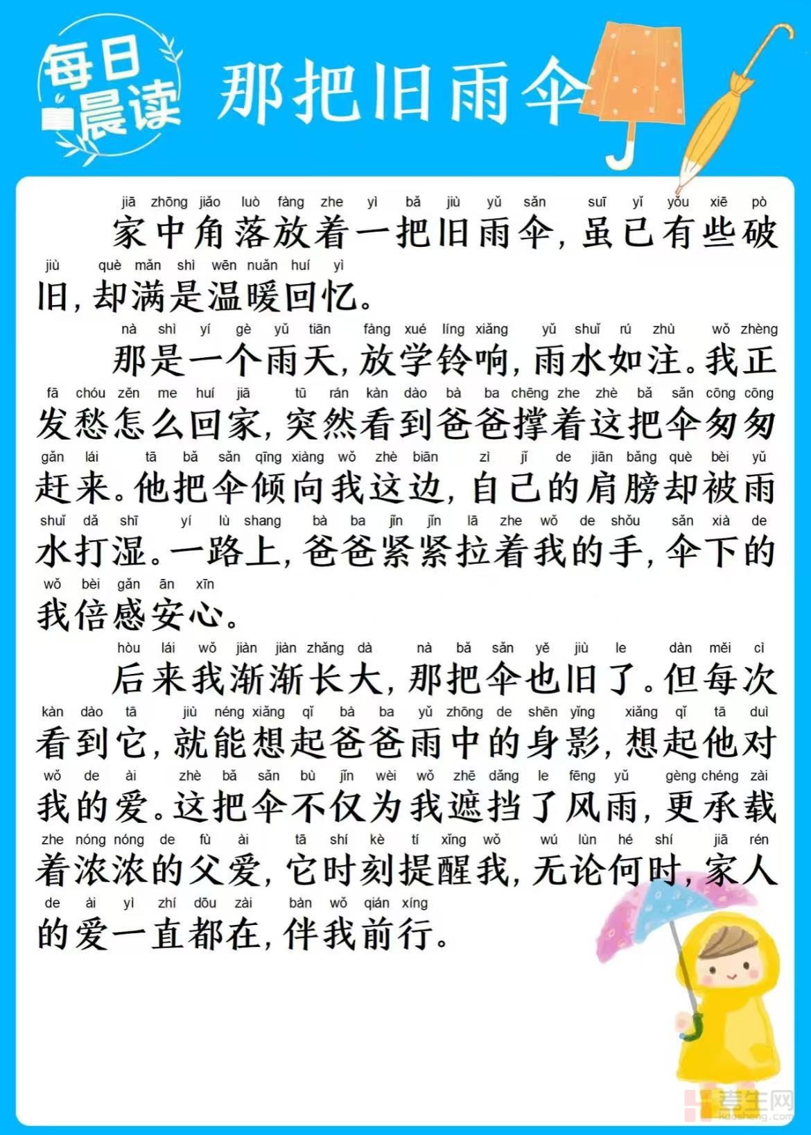 无论你是学生群体,想通过晨读积累情感类写作素材,让作文摆脱空洞,在考试中打动阅卷老师;还是想记录身边旧物故事、留存时光记忆的普通人;亦或是教育工作者,希望用资料引导孩子关注生活细节、学会表达情感,这份《那把旧雨伞》晨读 + 练笔资料都能精准满足你的需求。