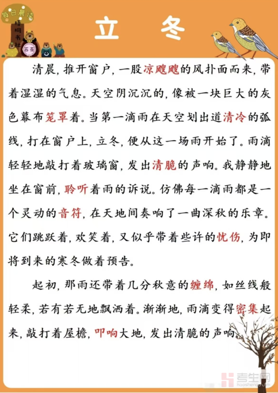 资料已上传至考生网,下载路径简单便捷:登录考生网,搜索 “《立冬》晨读 + 练笔资料”,即可一键获取。你可以在清晨伴着晨光品读立冬故事,也可以在冬日闲暇时结合经历完成练笔,让每一段文字都盛满冬日的静谧与暖意。