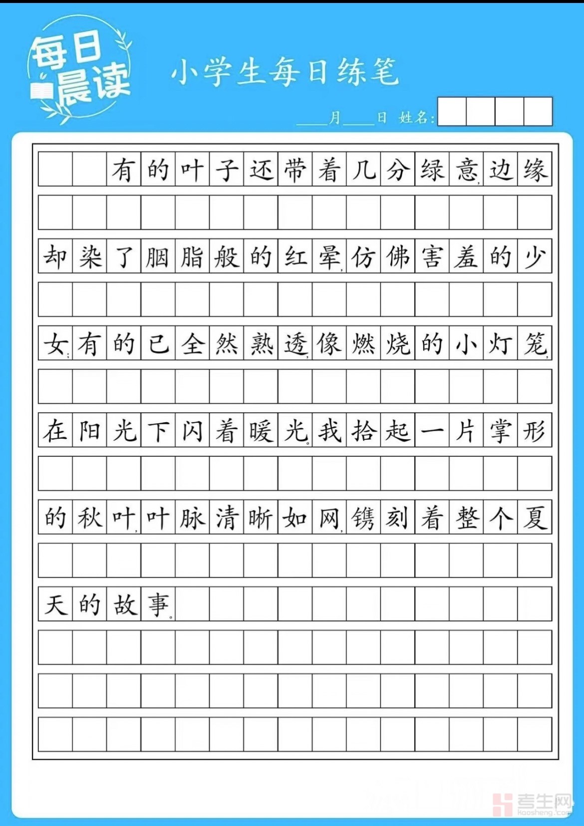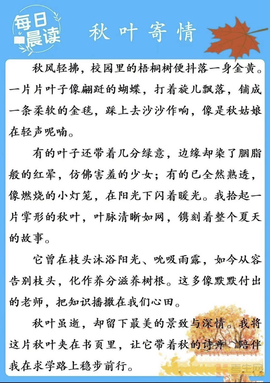 资料已上传至考生网,下载路径简单便捷:登录考生网,搜索 “《秋叶寄情》晨读 + 练笔资料”,即可一键获取。你可以在清晨伴着晨光品读秋叶与深情的故事,也可以在秋日午后拾起一片落叶,结合自身情感完成练笔,让每一段文字都盛满秋叶的诗意与真挚的情感。
