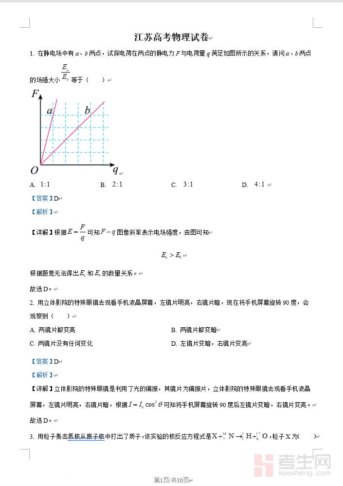 1. 在静电场中有a、b两点,试探电荷在两点的静电力F与电荷量q满足如图所示的关系,请问a、b两点